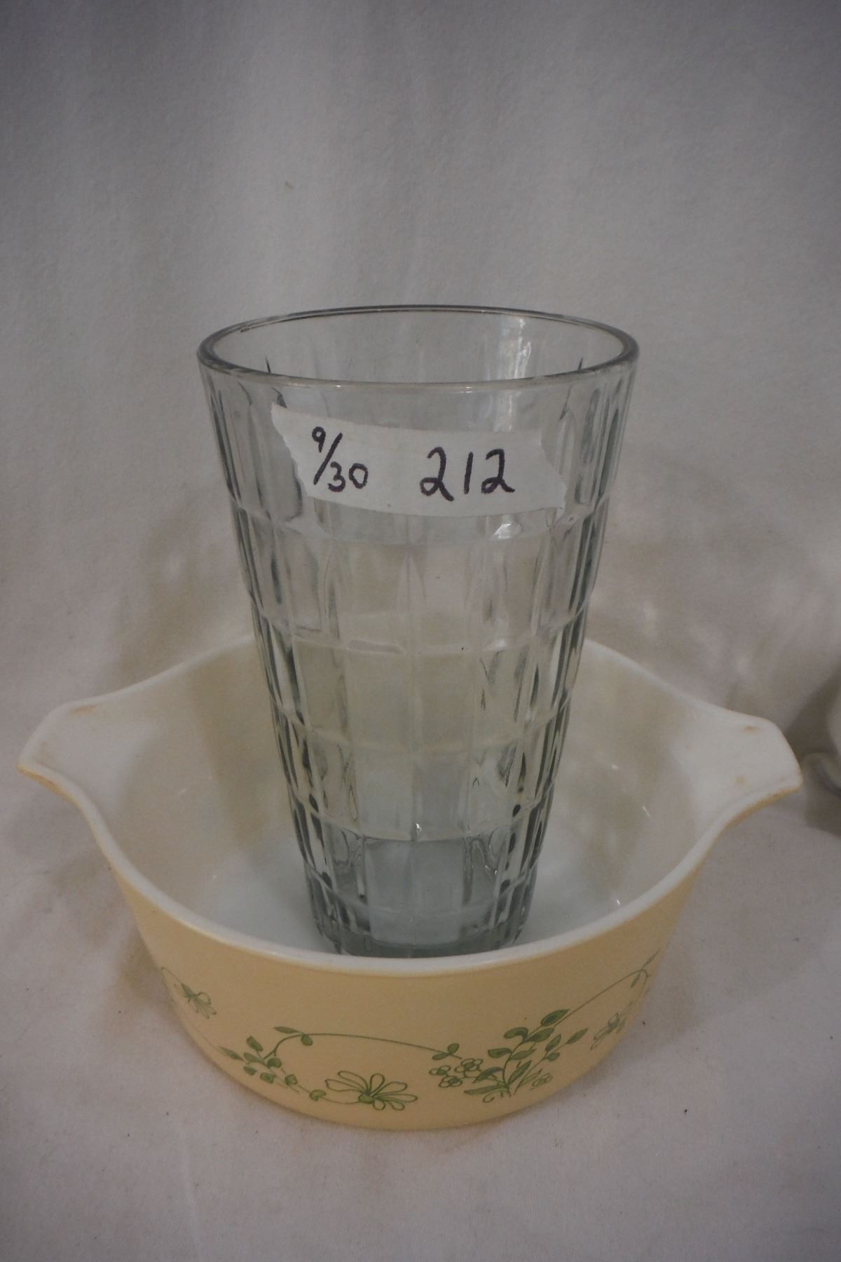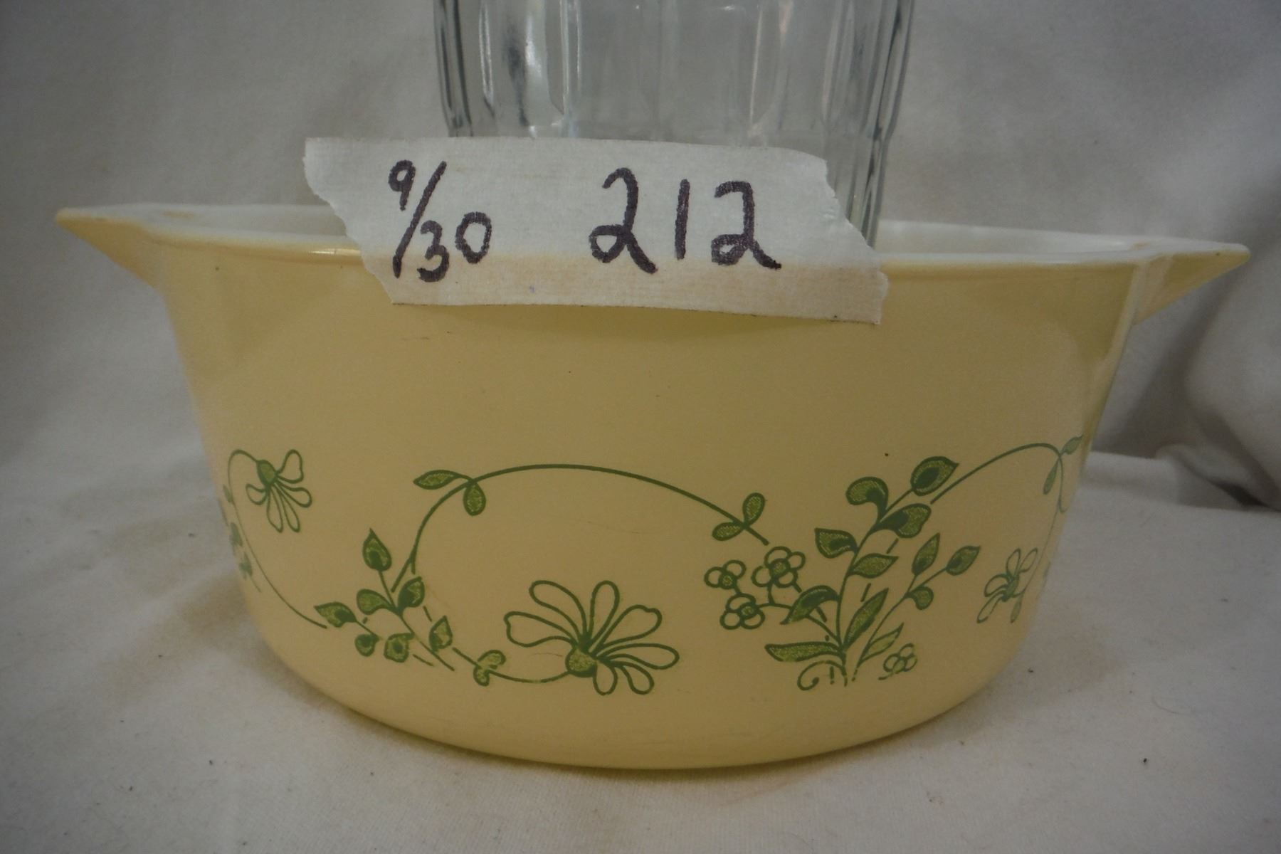 475 Pyrex green ivy, casserole, with glass vase