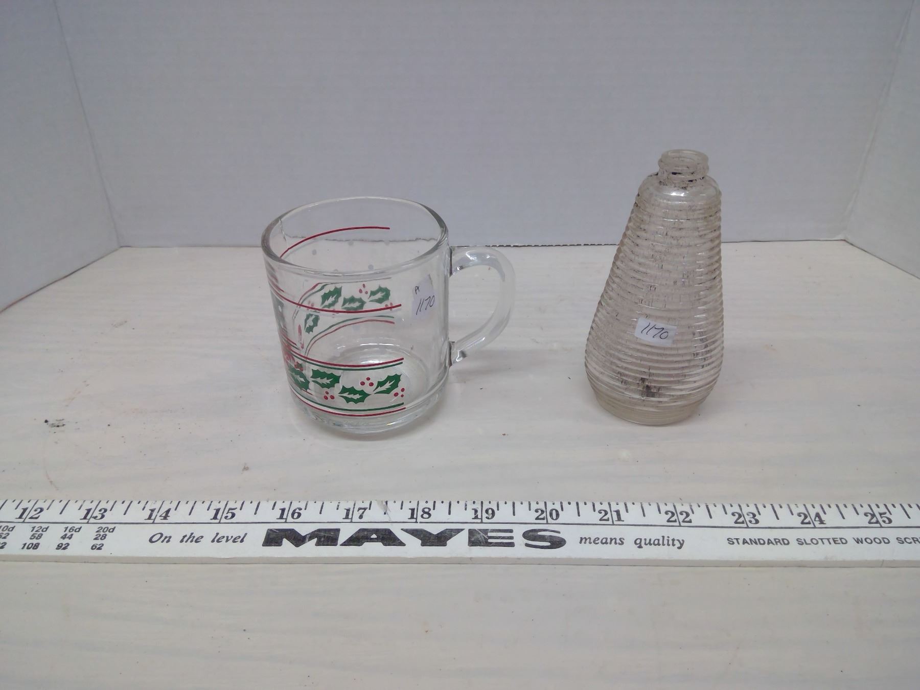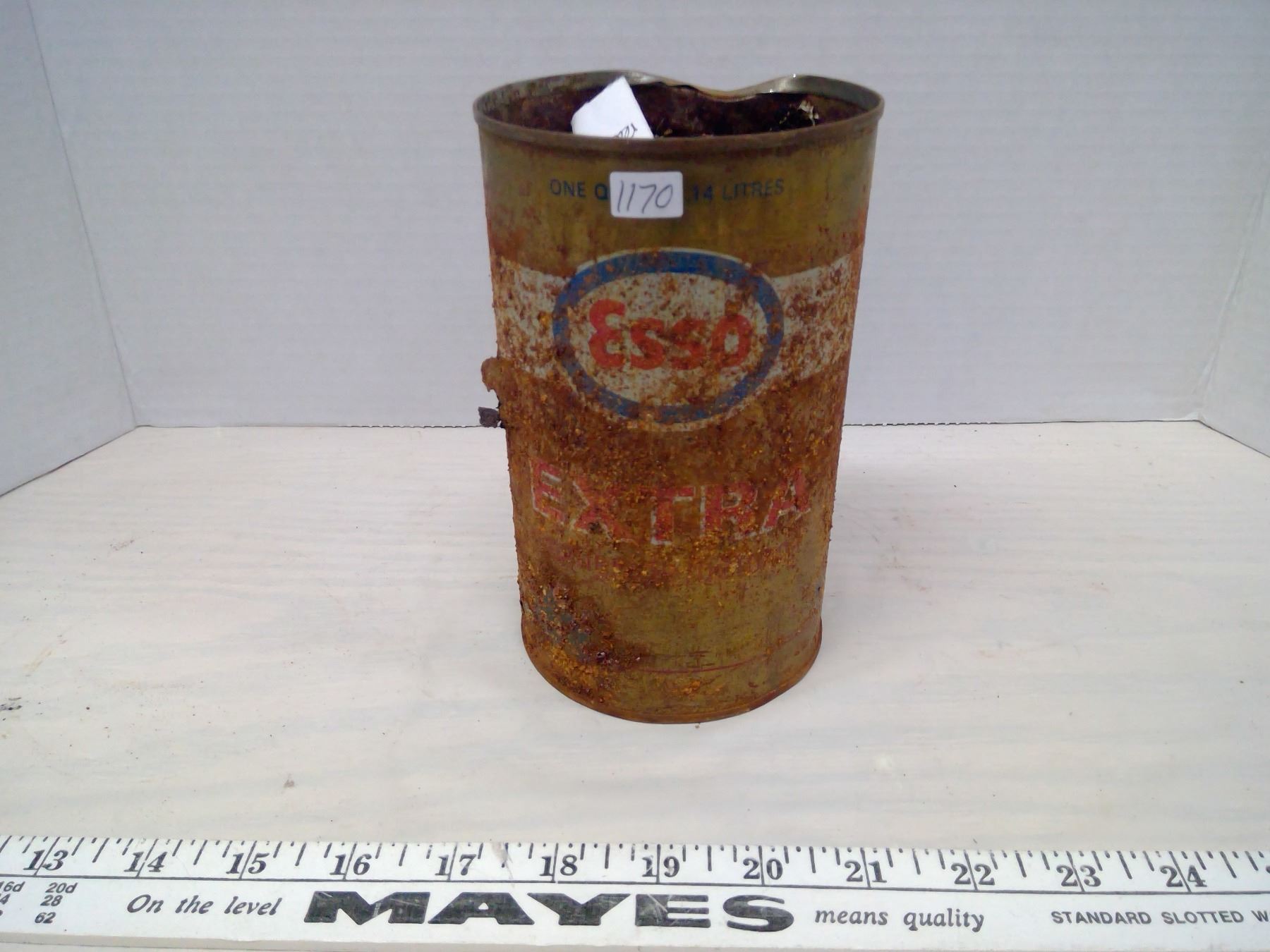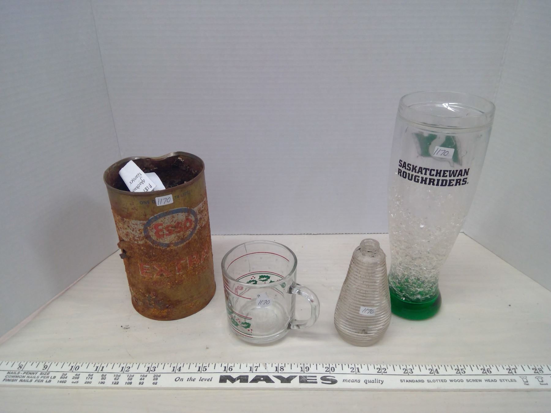 4pc. Esso Oil Tin Planter, Riders Cup, Glass Christmas Mug, Glass Perfume Bottle (no lid)