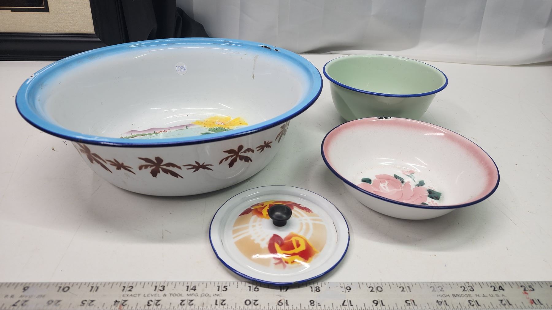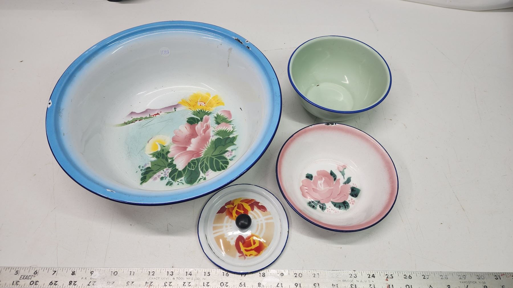 4pcs of enamel-ware dishes - wash basin, bowls and lid