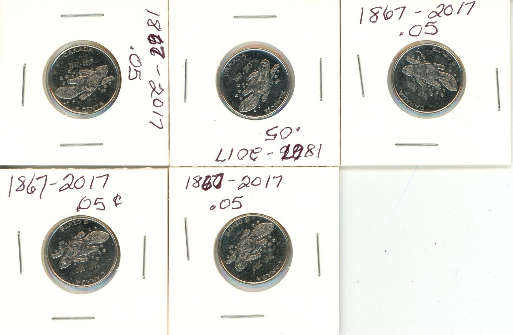 (5) 1867-2017 Canadian 150 Anniversary of Confederation 5 Cents Coin.