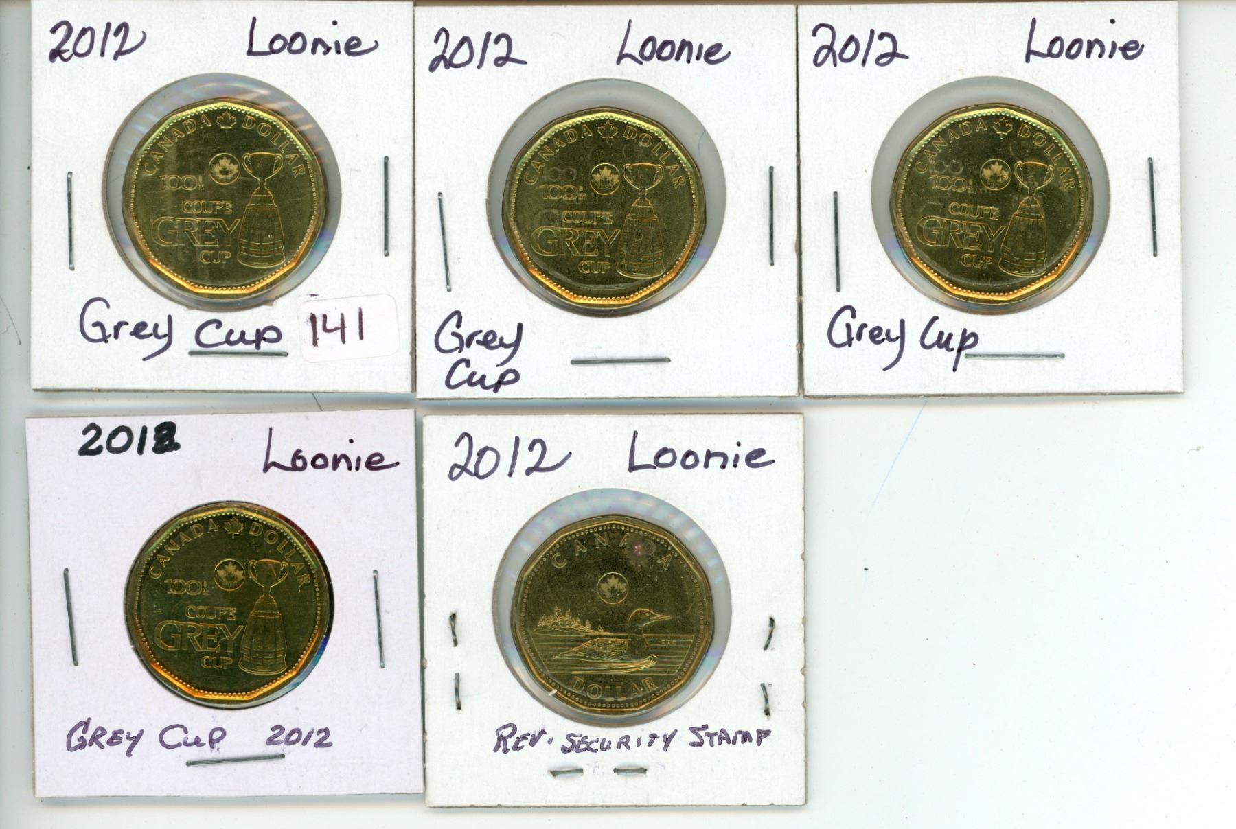 5 - 2012 Canadian loonie dollar coins - 4 Grey Cup