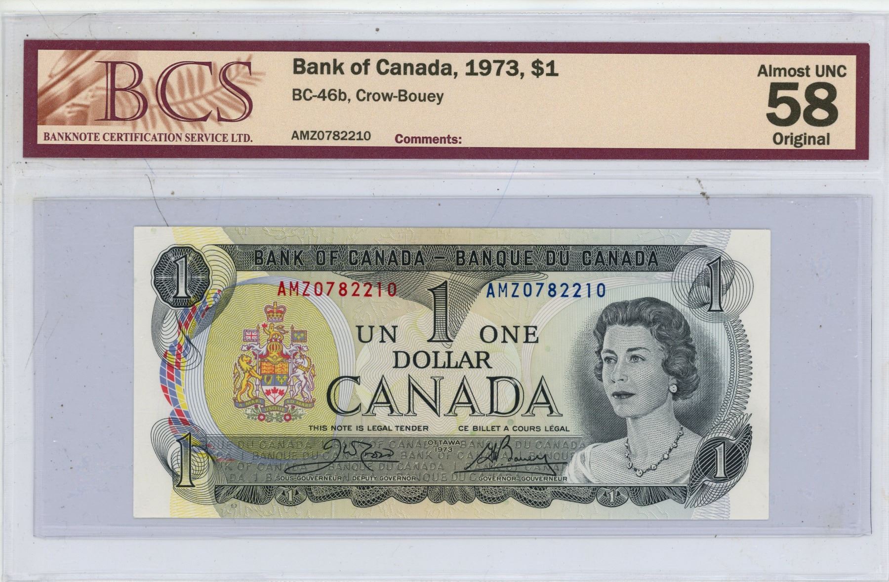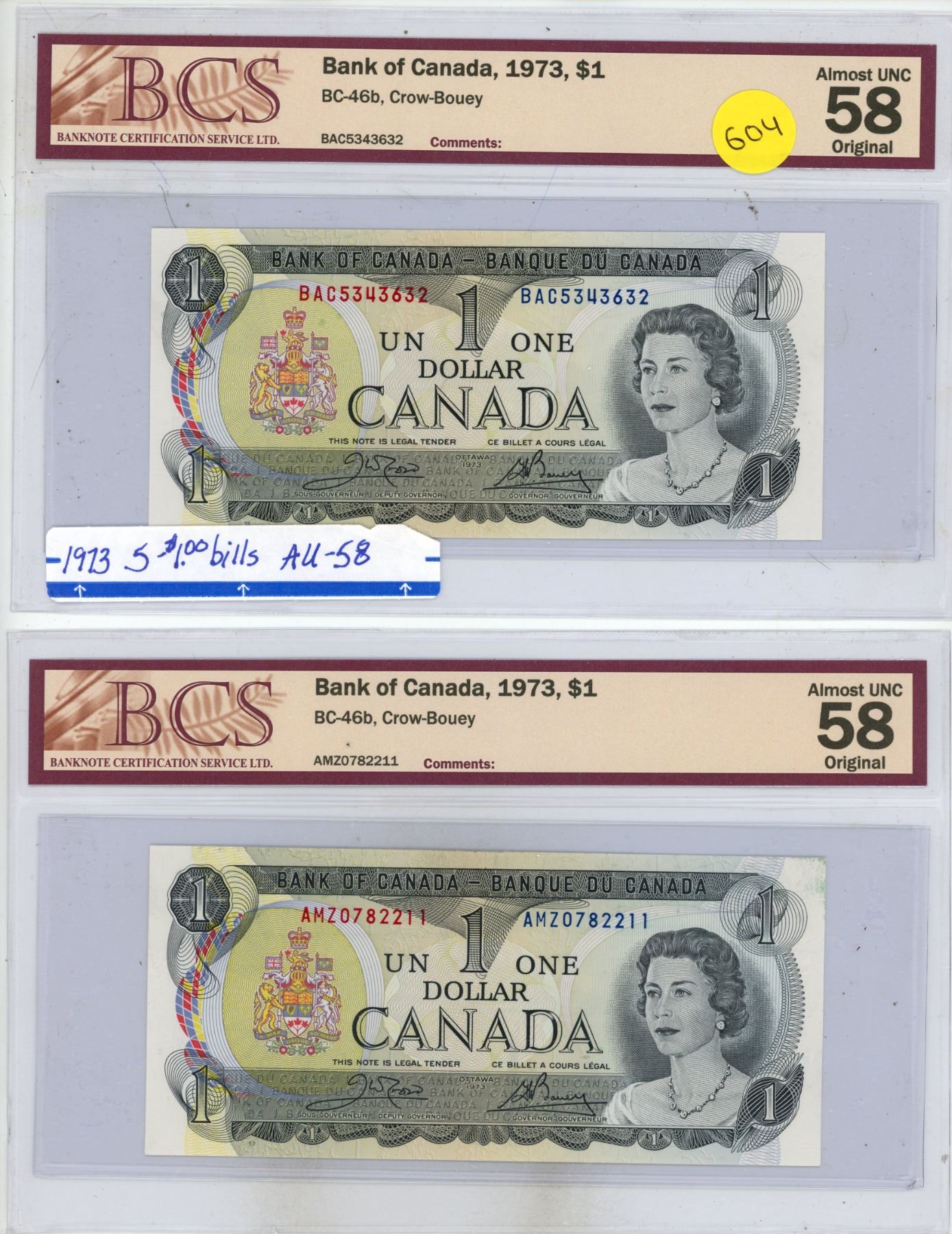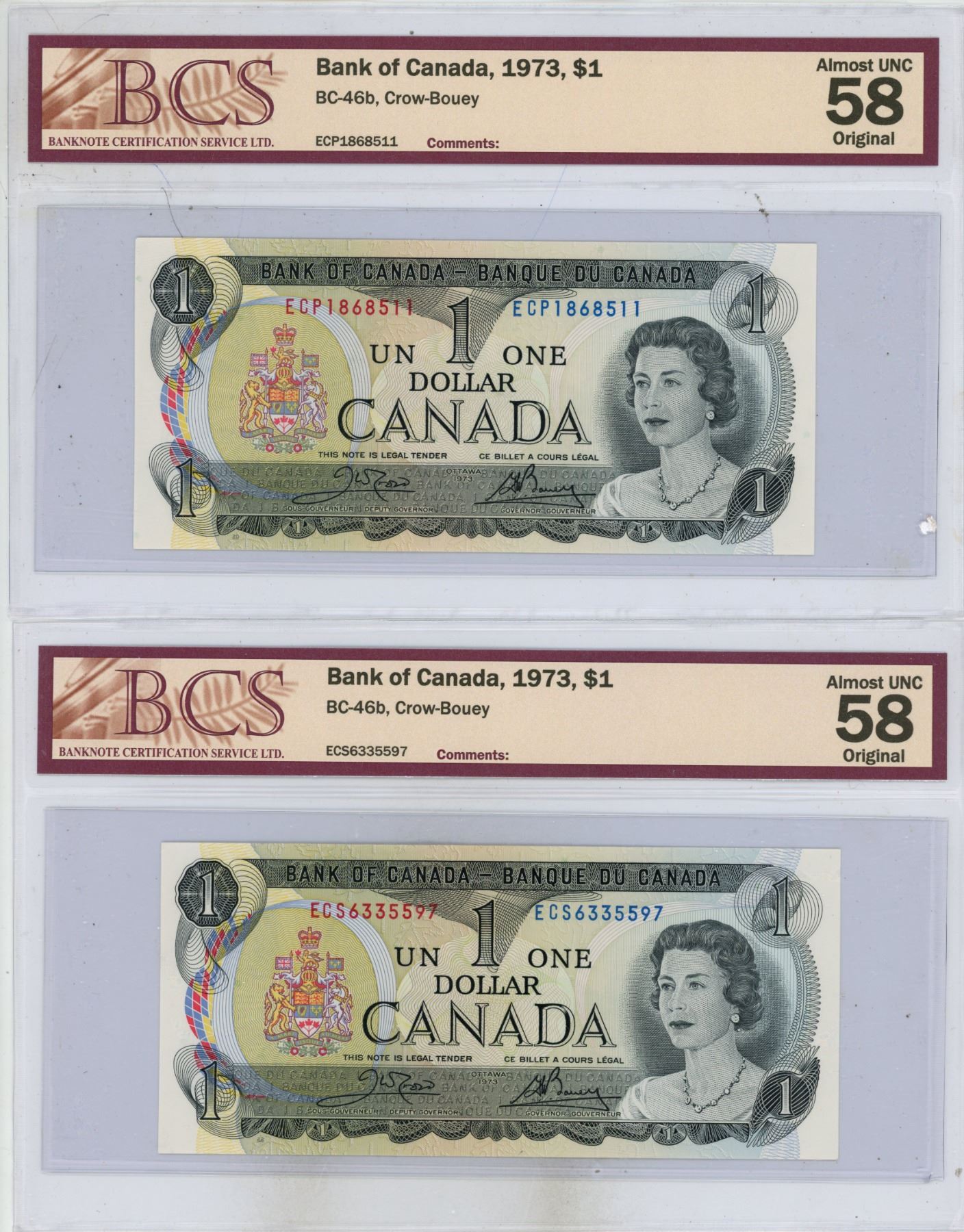 (5) BCS - Bank of Canada, 1973, $1 BC-46b, Crow-Bouey, Almost UNC 58 Original - (AMZ0782210 and AMZ0