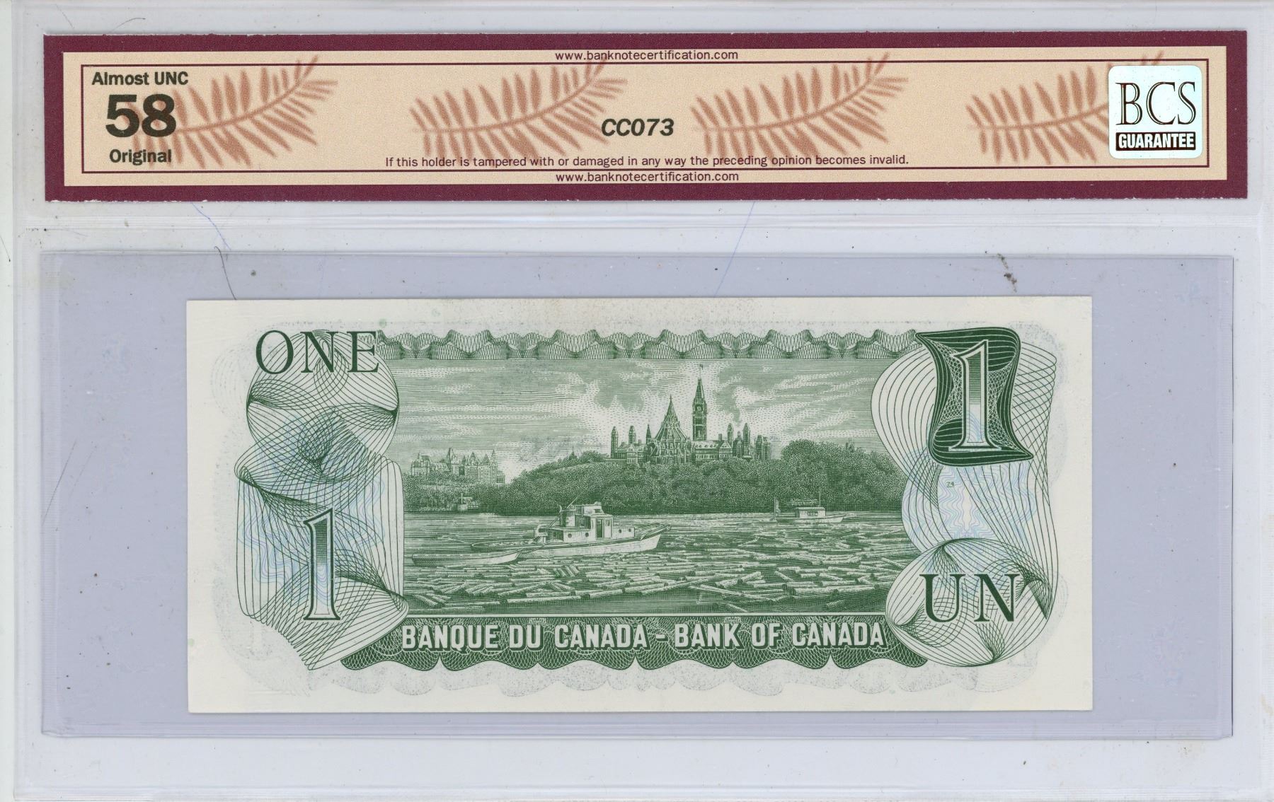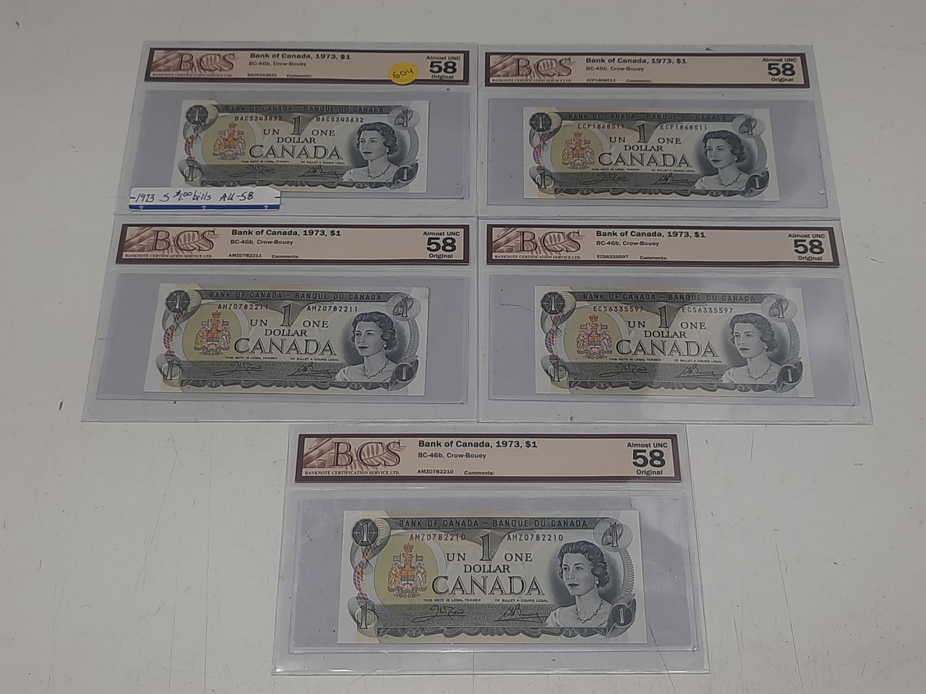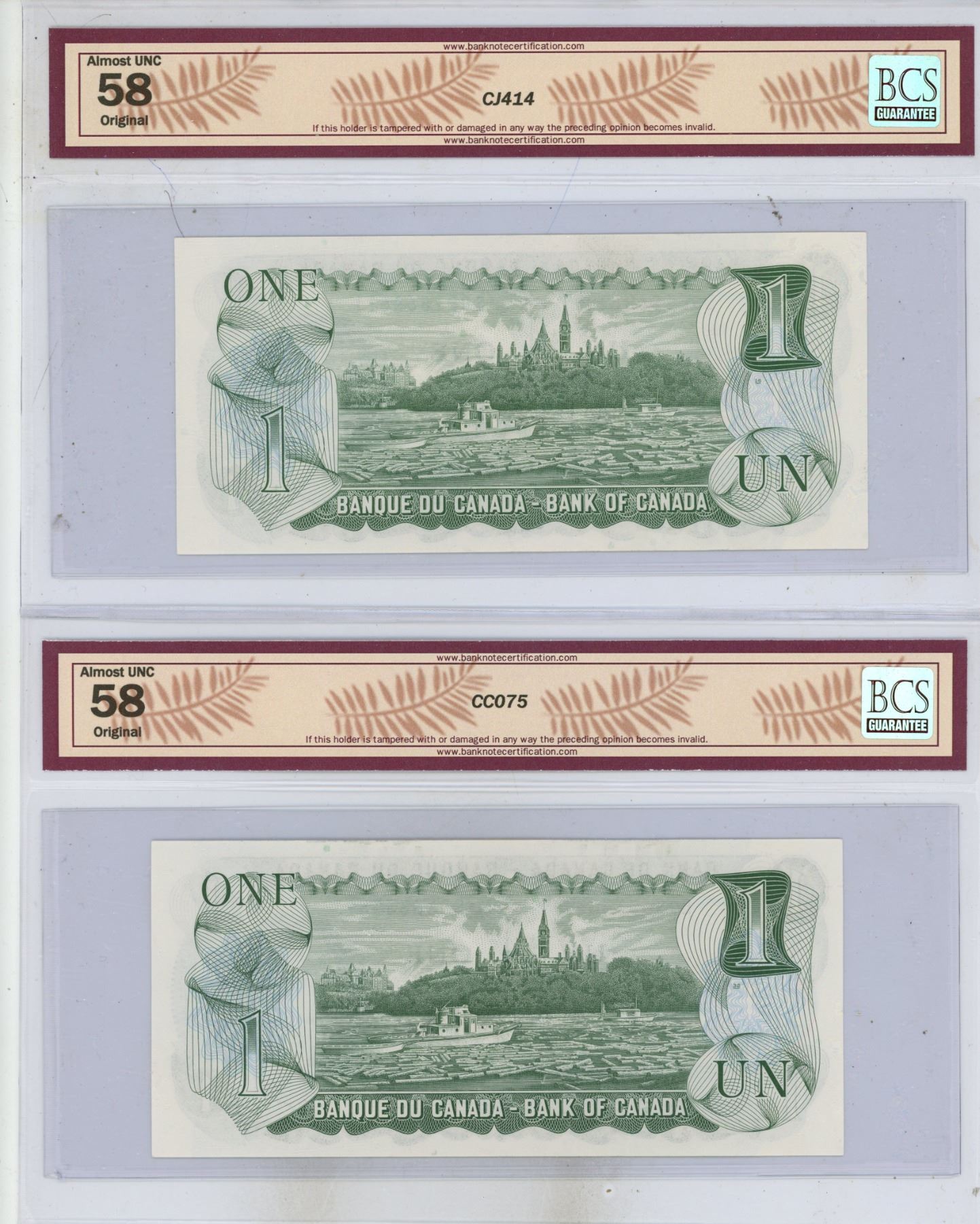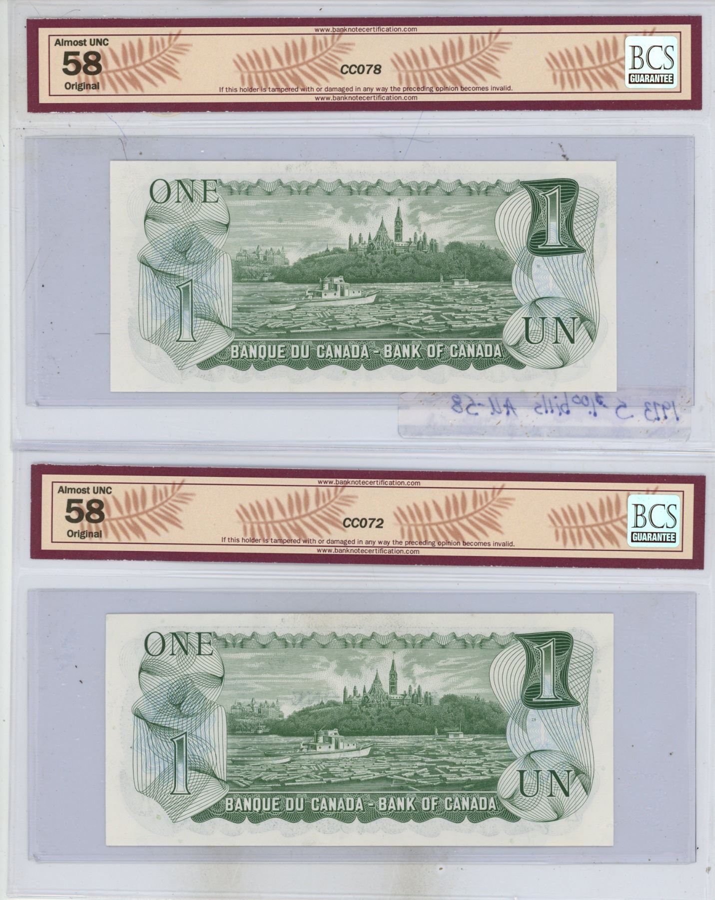 (5) BCS - Bank of Canada, 1973, $1 BC-46b, Crow-Bouey, Almost UNC 58 Original - (AMZ0782210 and AMZ0