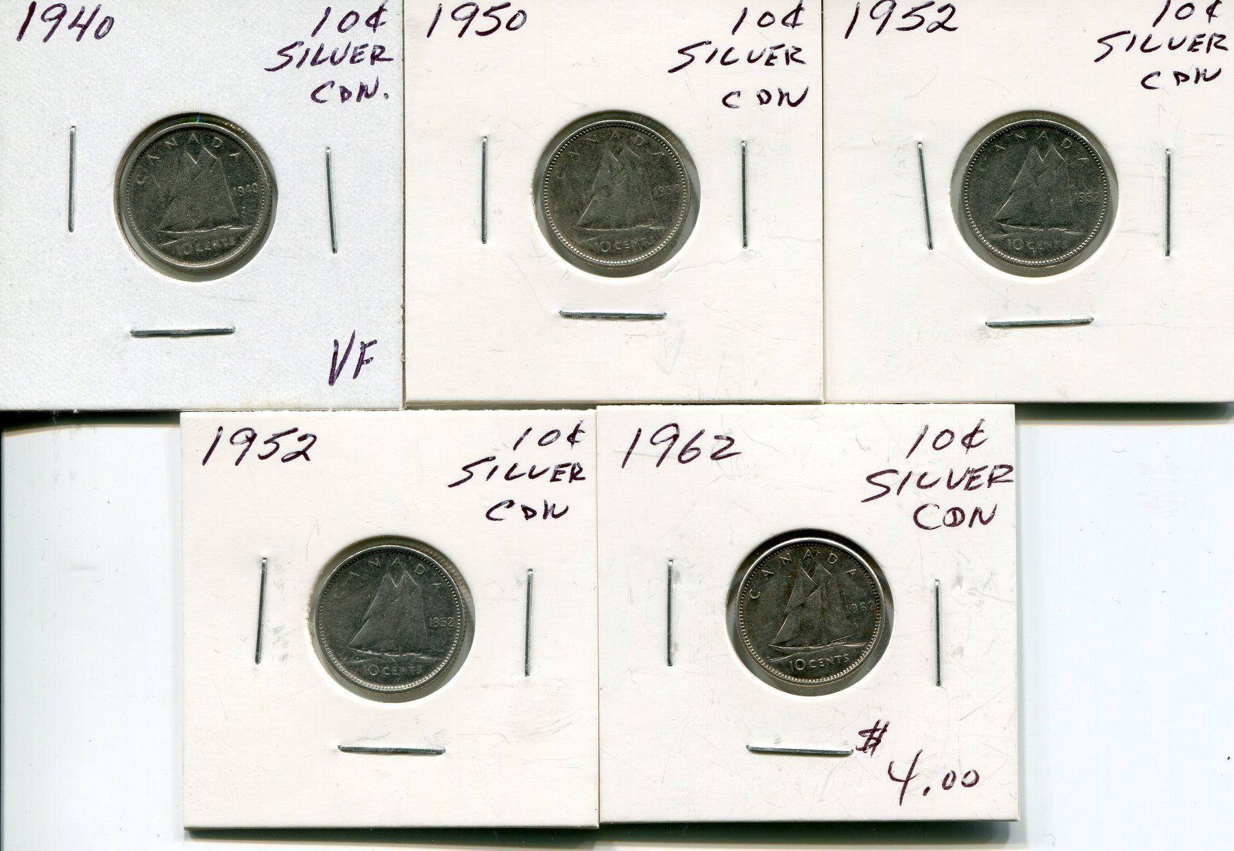 5 CNDN SILVER DIME 1940, 50, 52, 52, 62