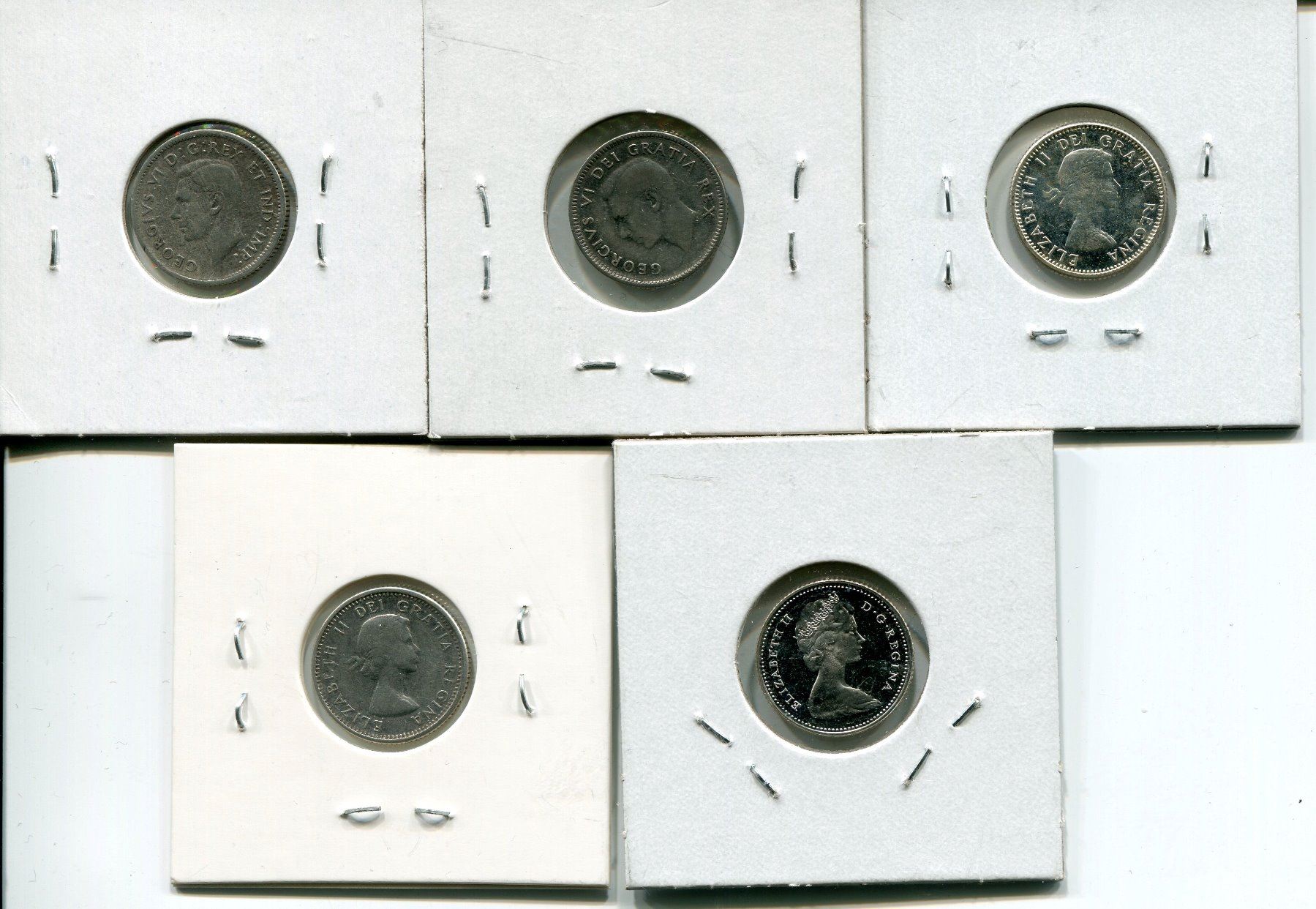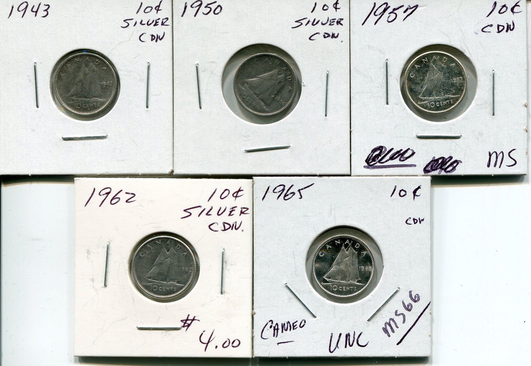 5 CNDN SILVER DIME 1943, 50, 57, 62, 65