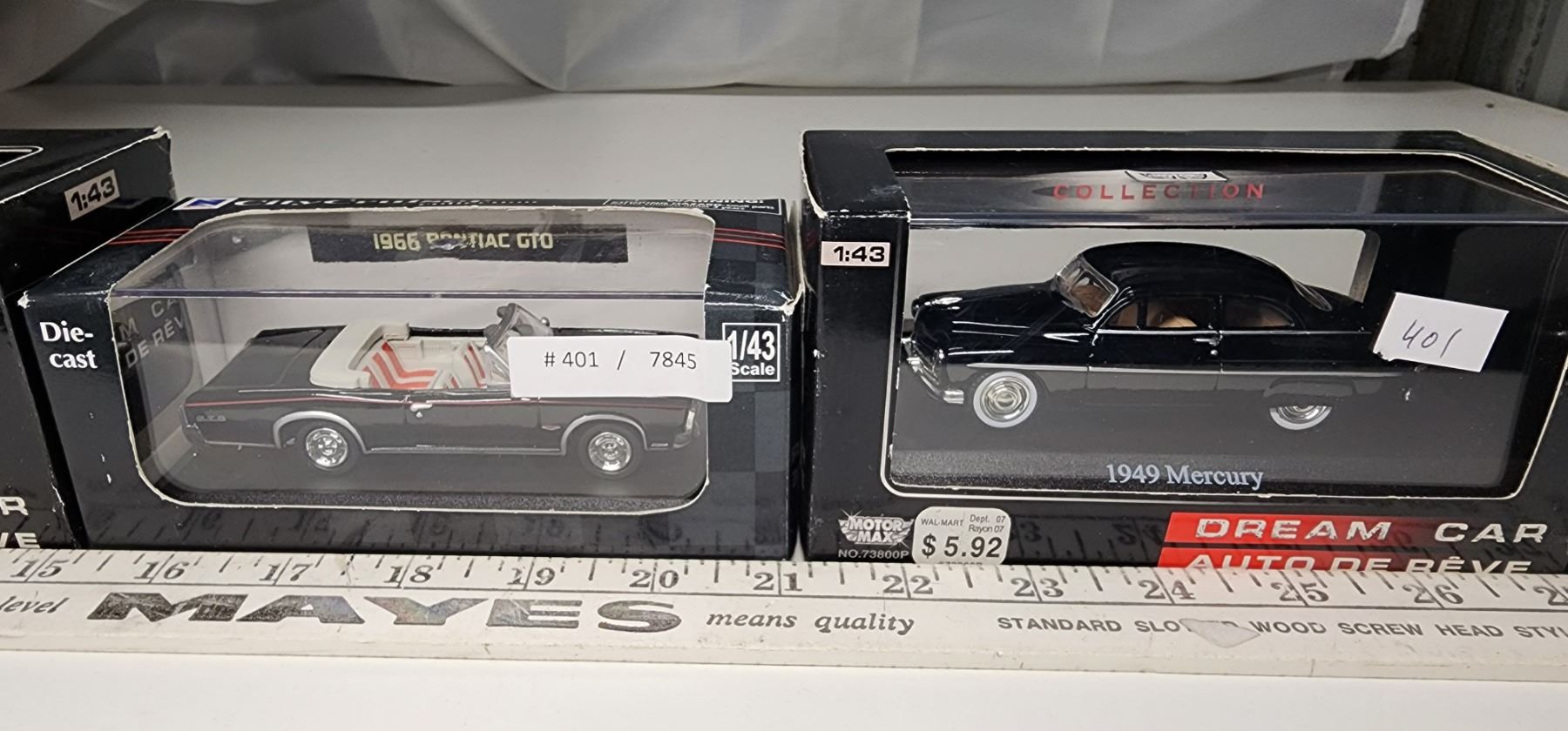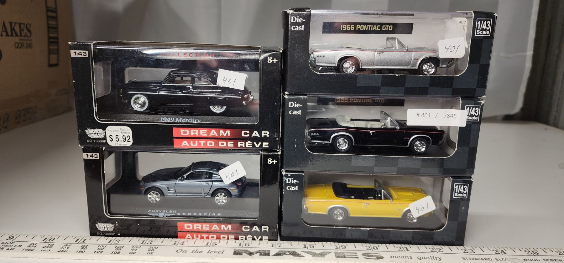 5 Diecast 1:43 Scale, 1949 Mercury, Chrysler Crossfire, 1966 Pontiac GTO (silver), 1966 Pontiac GTO