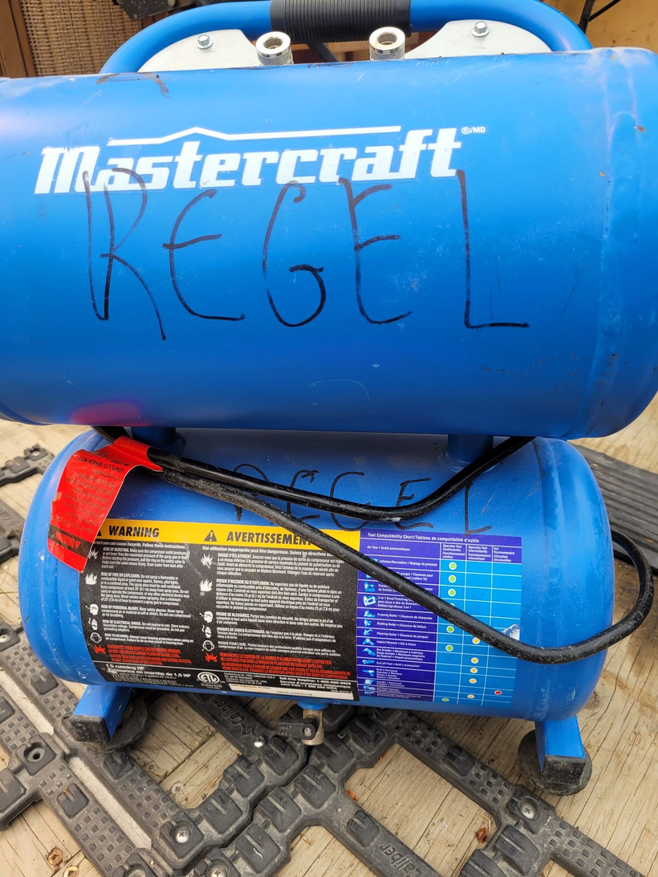 5 Gal. Mastercraft air compressor, with like new hose - tested, runs, no air leaks