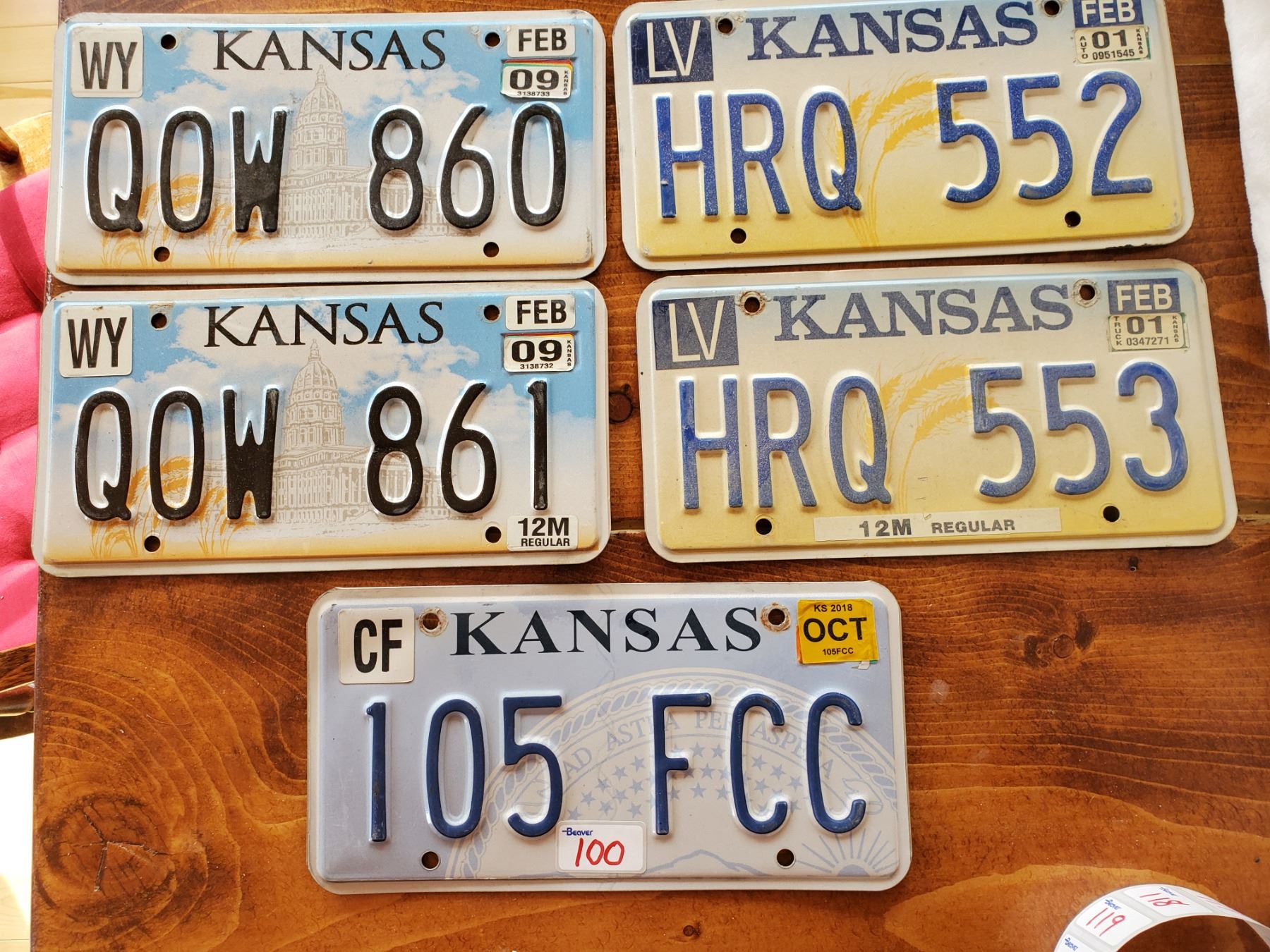 5 KANSAS LICENSE PLATES - 2 PAIRS WITH CONSECUTIVE NUMBERS