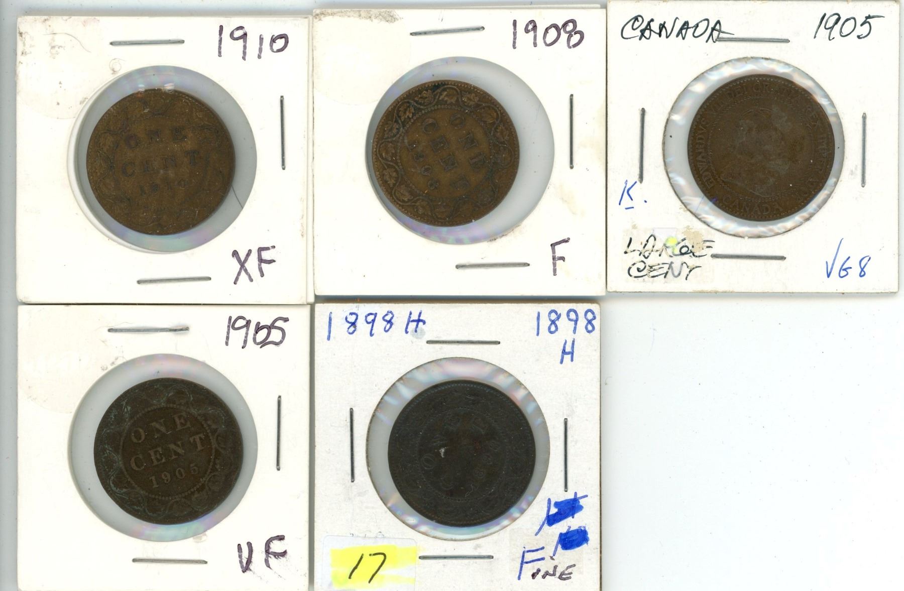 (5) Lot of Canadian 1¢ Coins (Years: 1898, 1905, 1905, 1908, 1910)