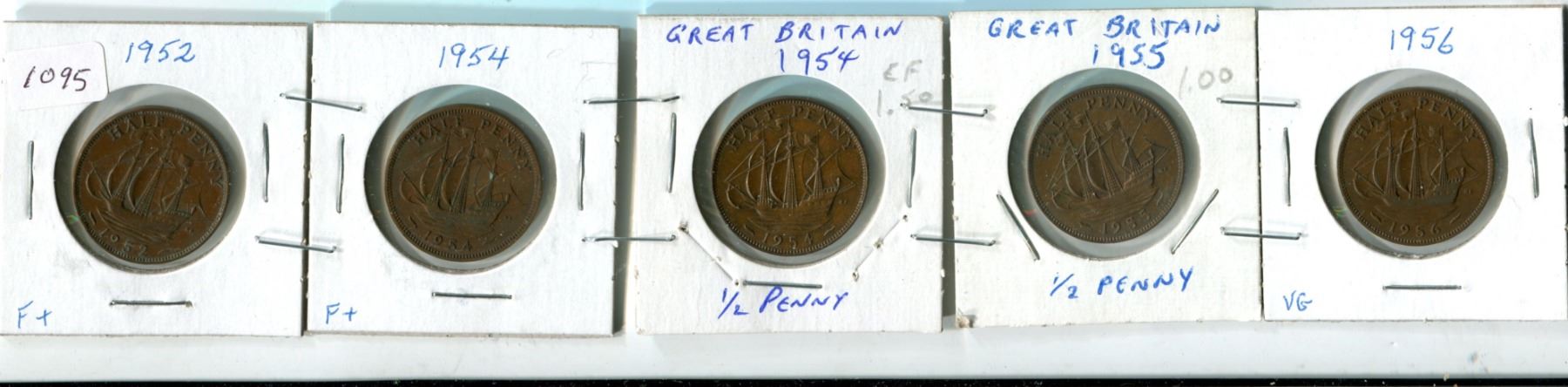 5 Queen Elizabeth II/ King Georgivs VI Half Pennies - 1952, 2x 1954, 1955, 1956