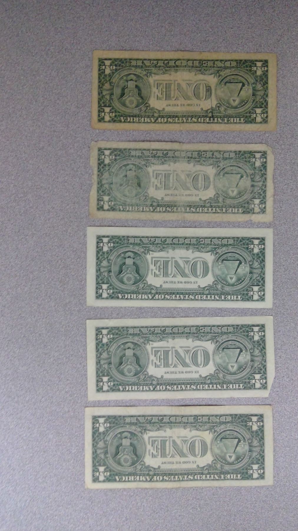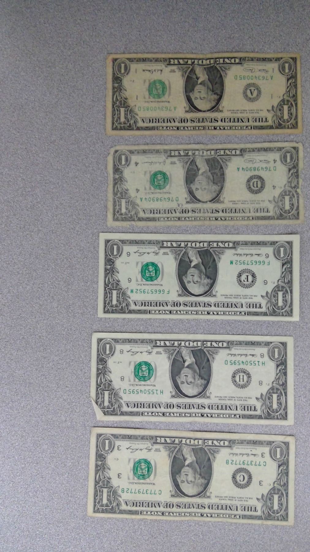 5 USA $1 Bills (2001, 2003, 2006(3) in plastic bag