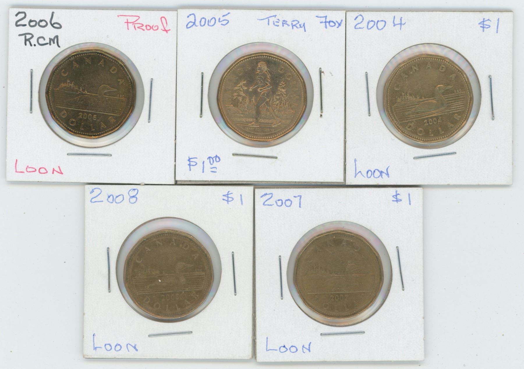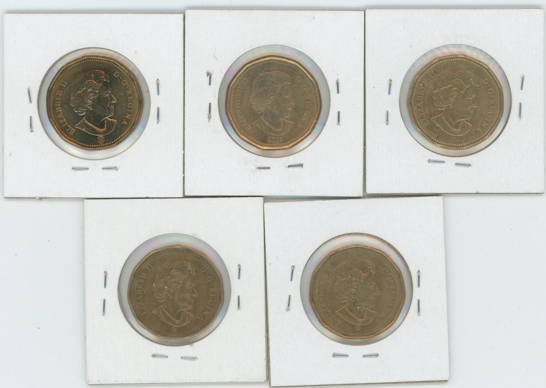 5 X 2004 - 2008 Canadian 1 Dollar Coins