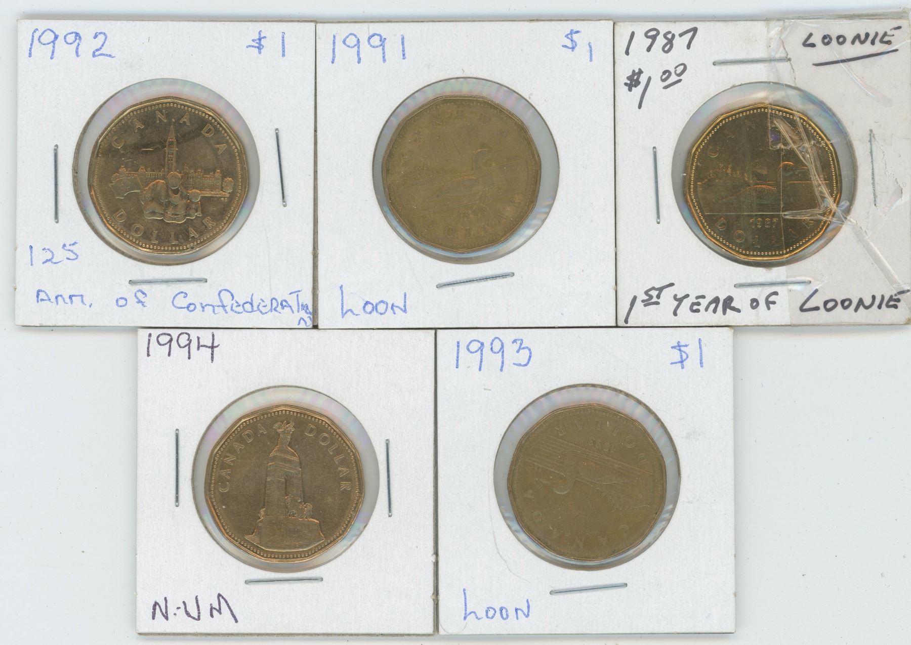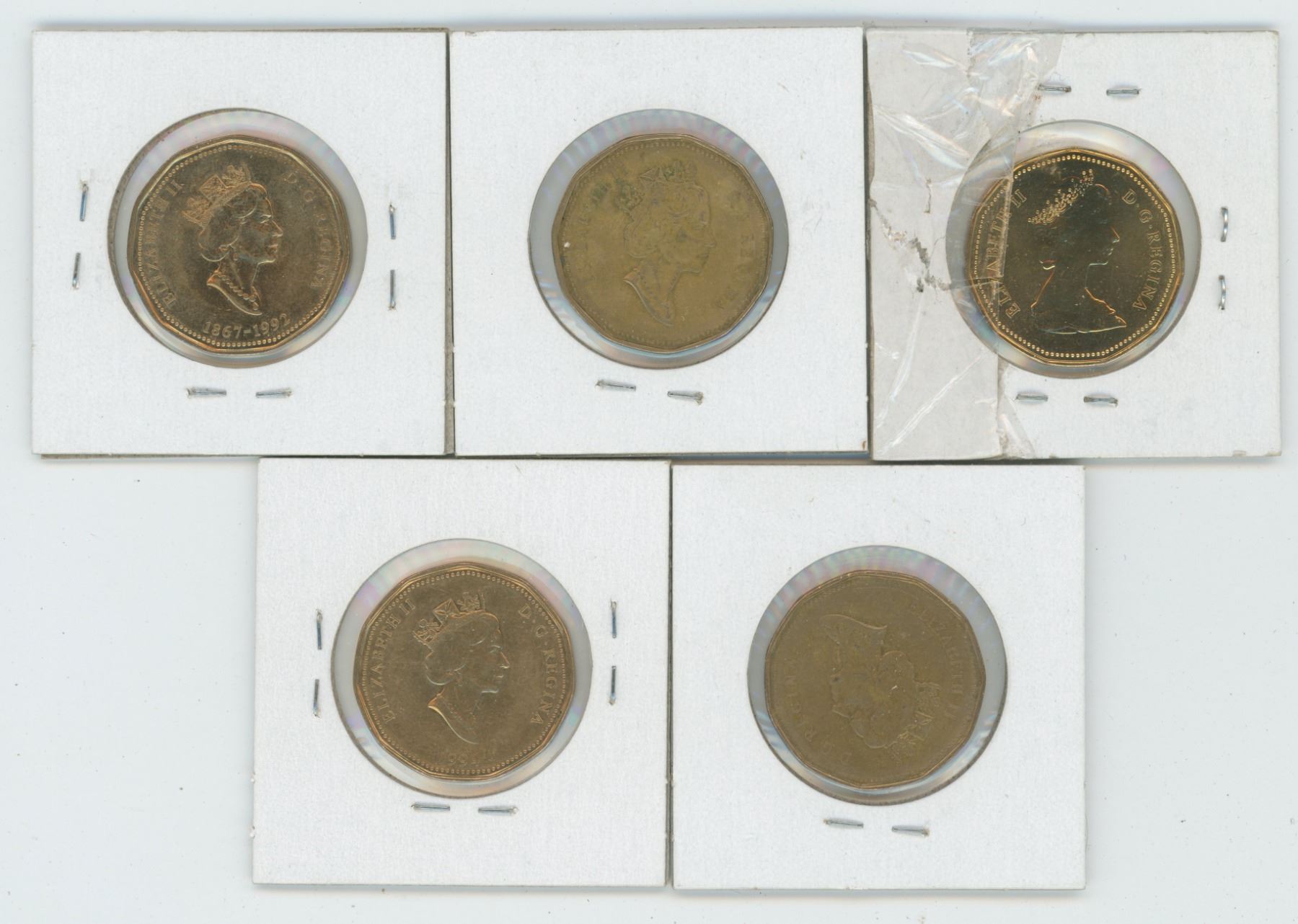5 X Various 1987 - 1994 Canadian 1 Dollar Coins