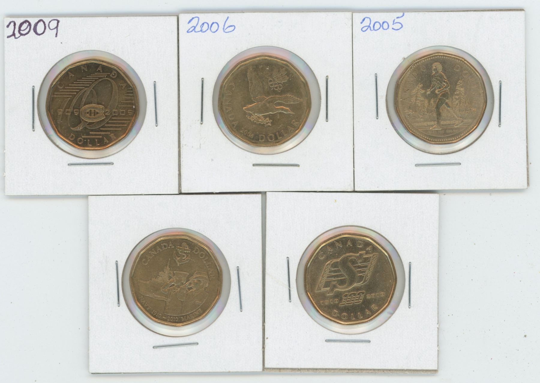5 X Various 2005 - 2010 Canadian 1 Dollar Coins