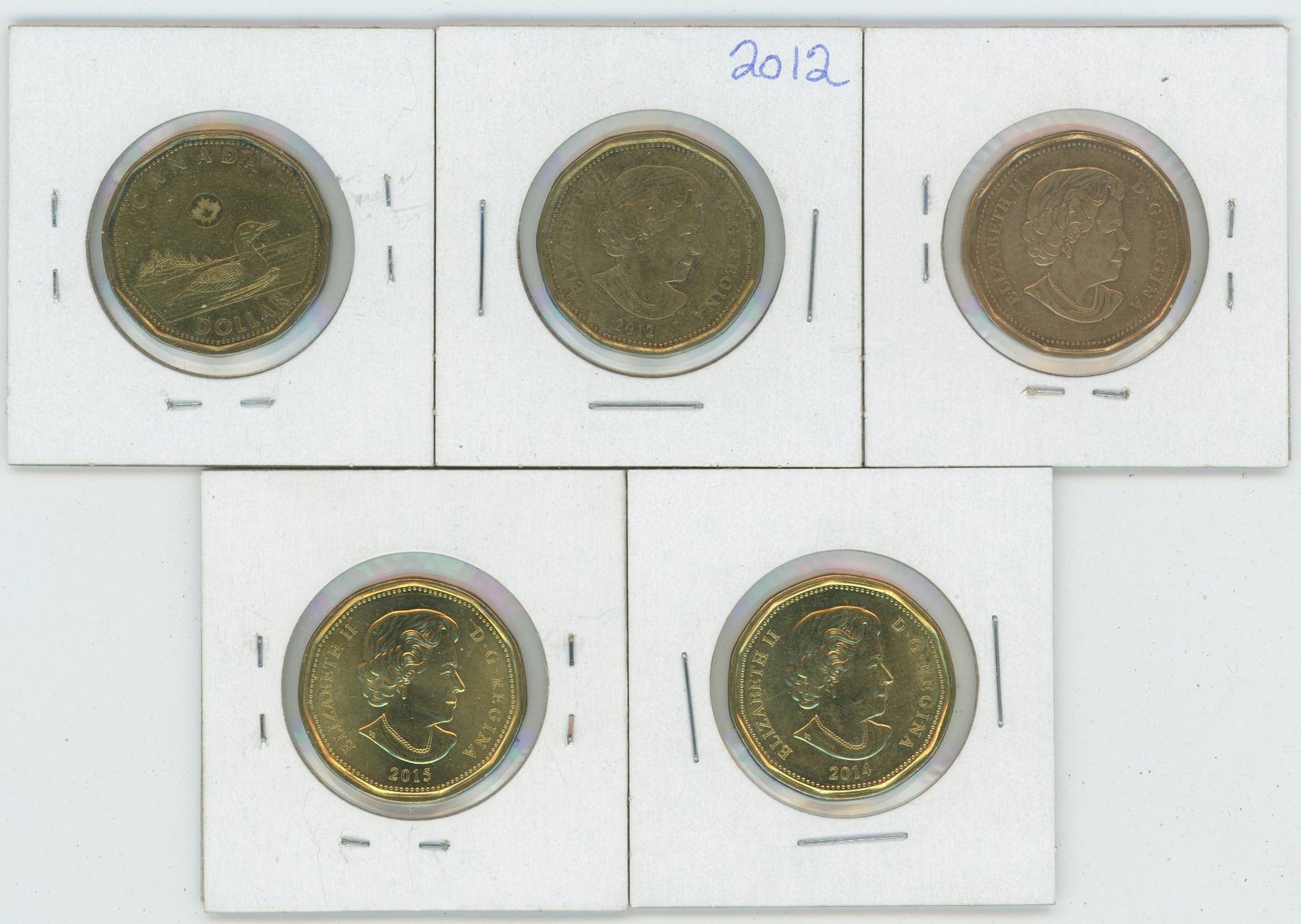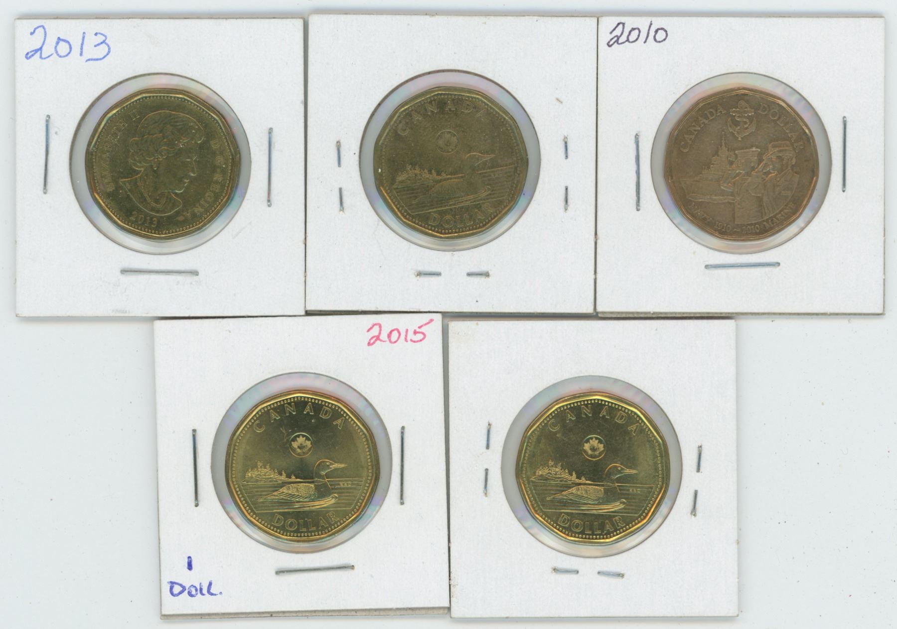 5 X Various 2010 - 2015 Canadian 1 Dollar Coins