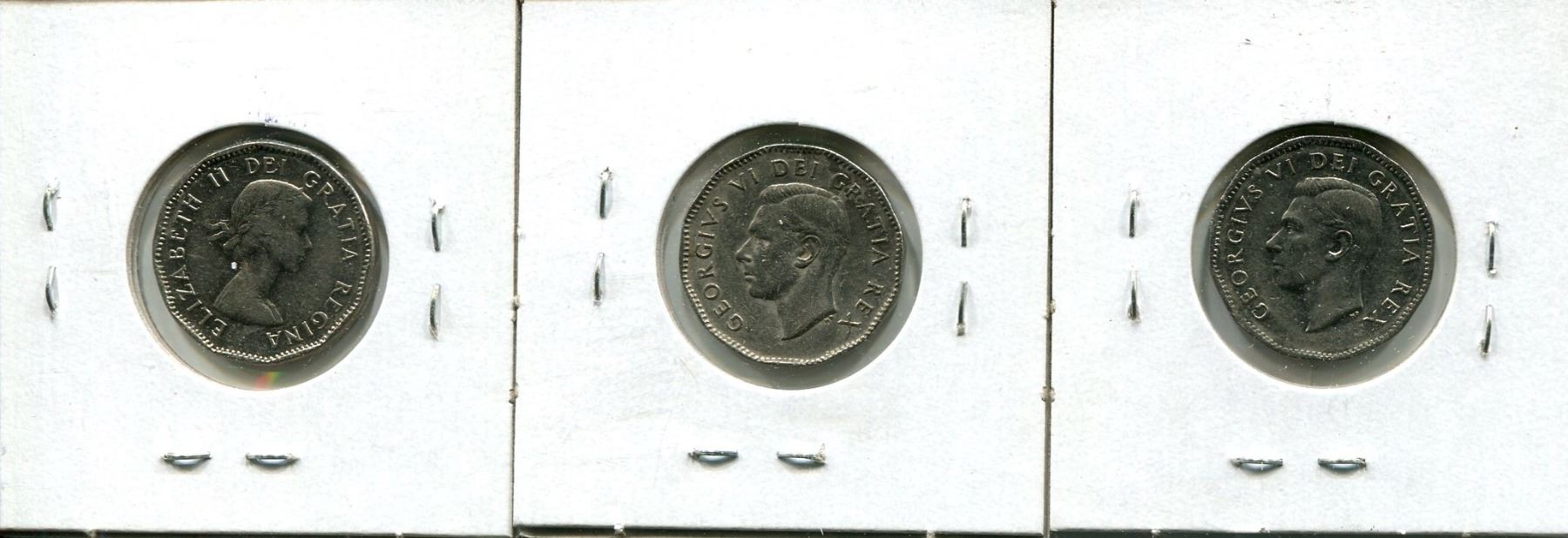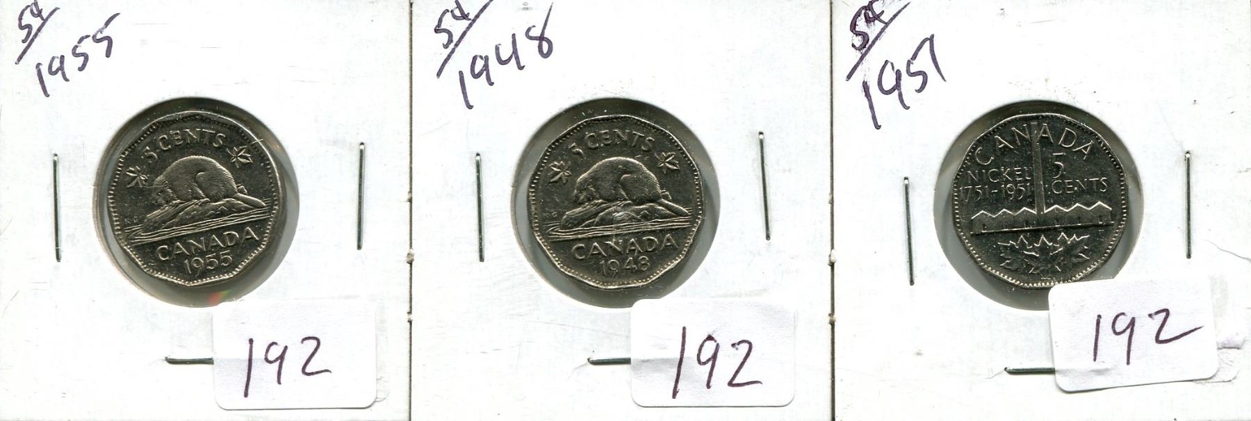 5 cents Canadian 1948 + 1951 +1955 nickel coin