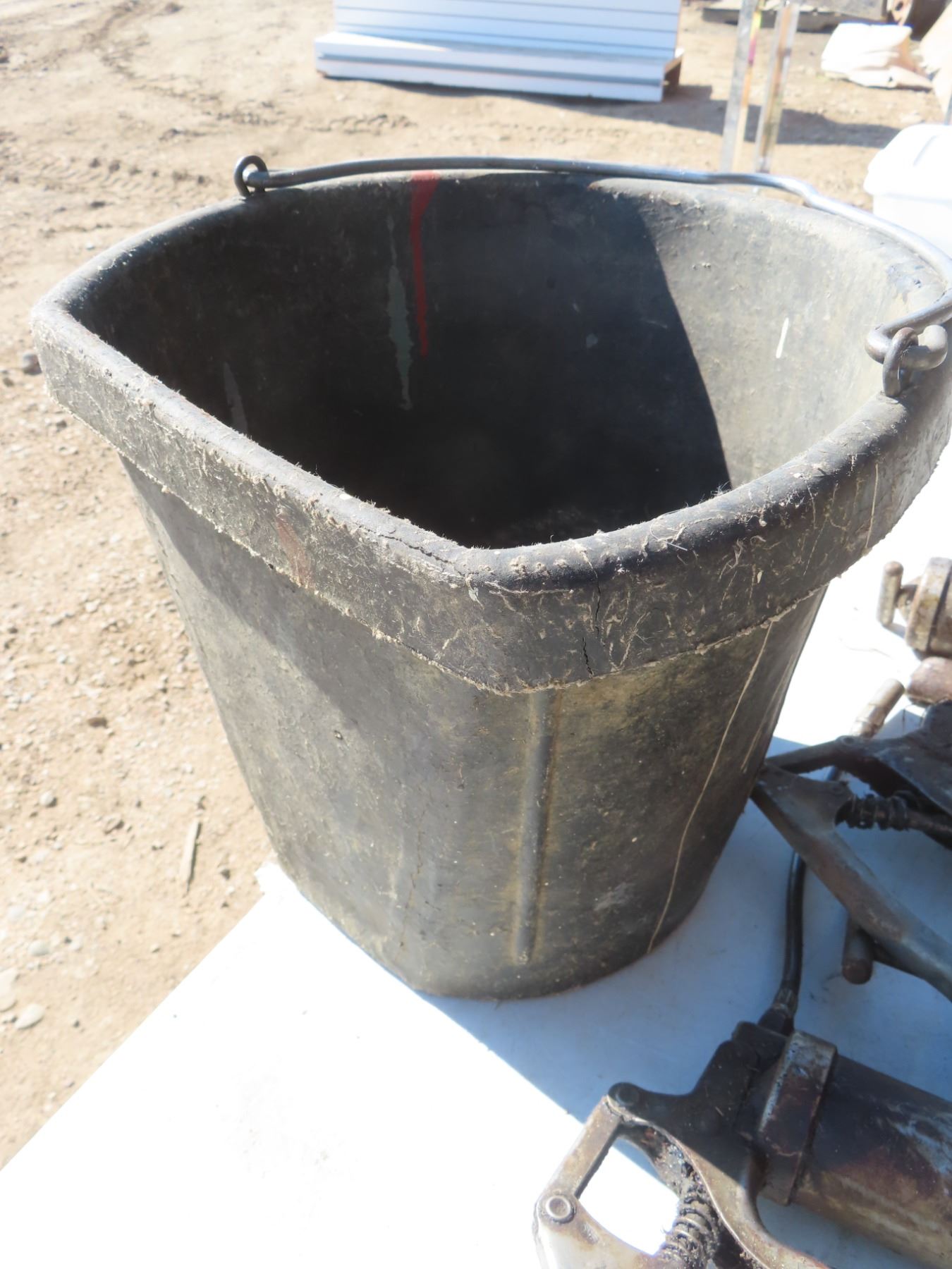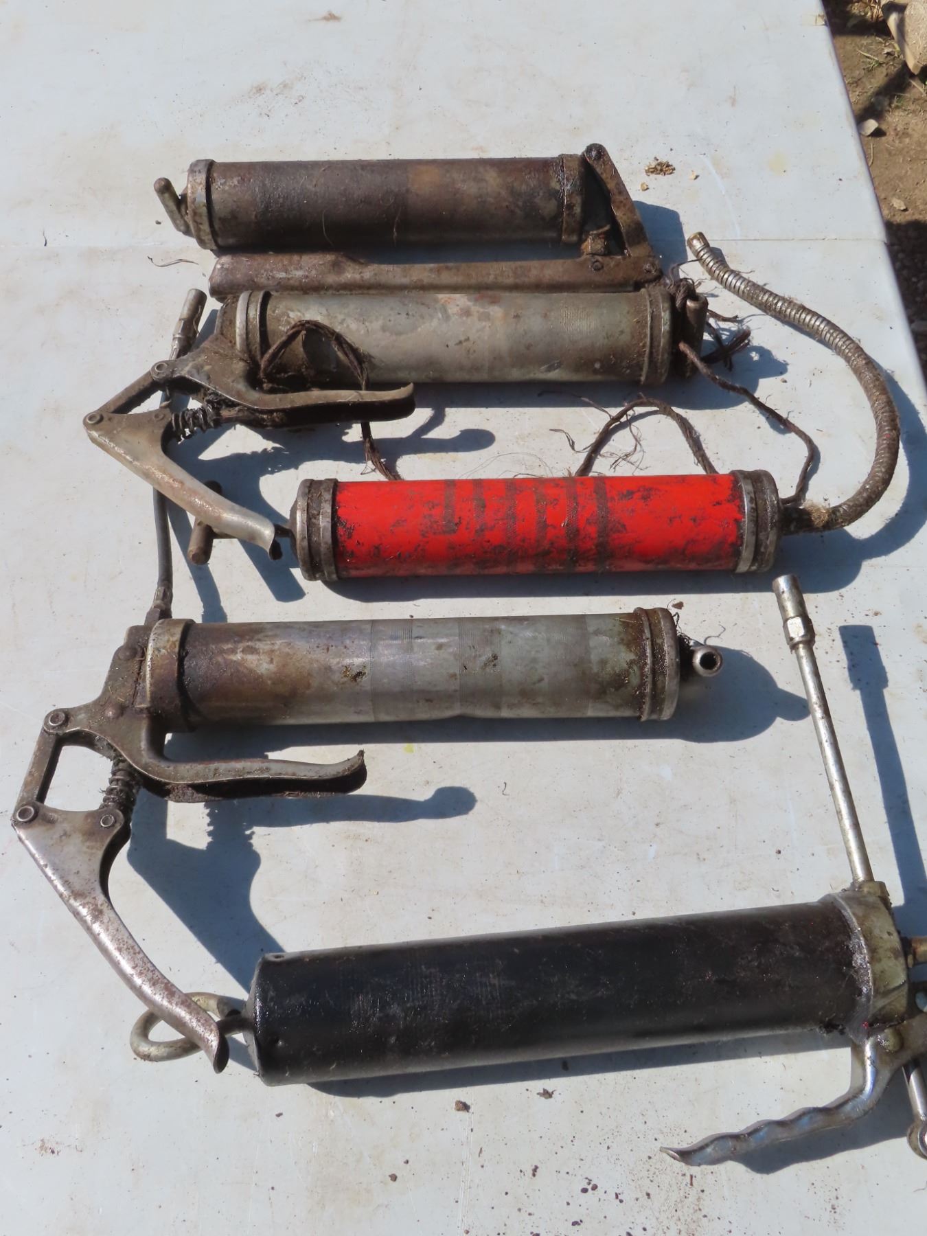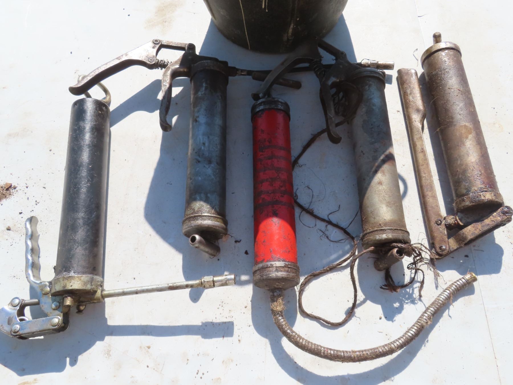 5 grease guns and rubber feed pail