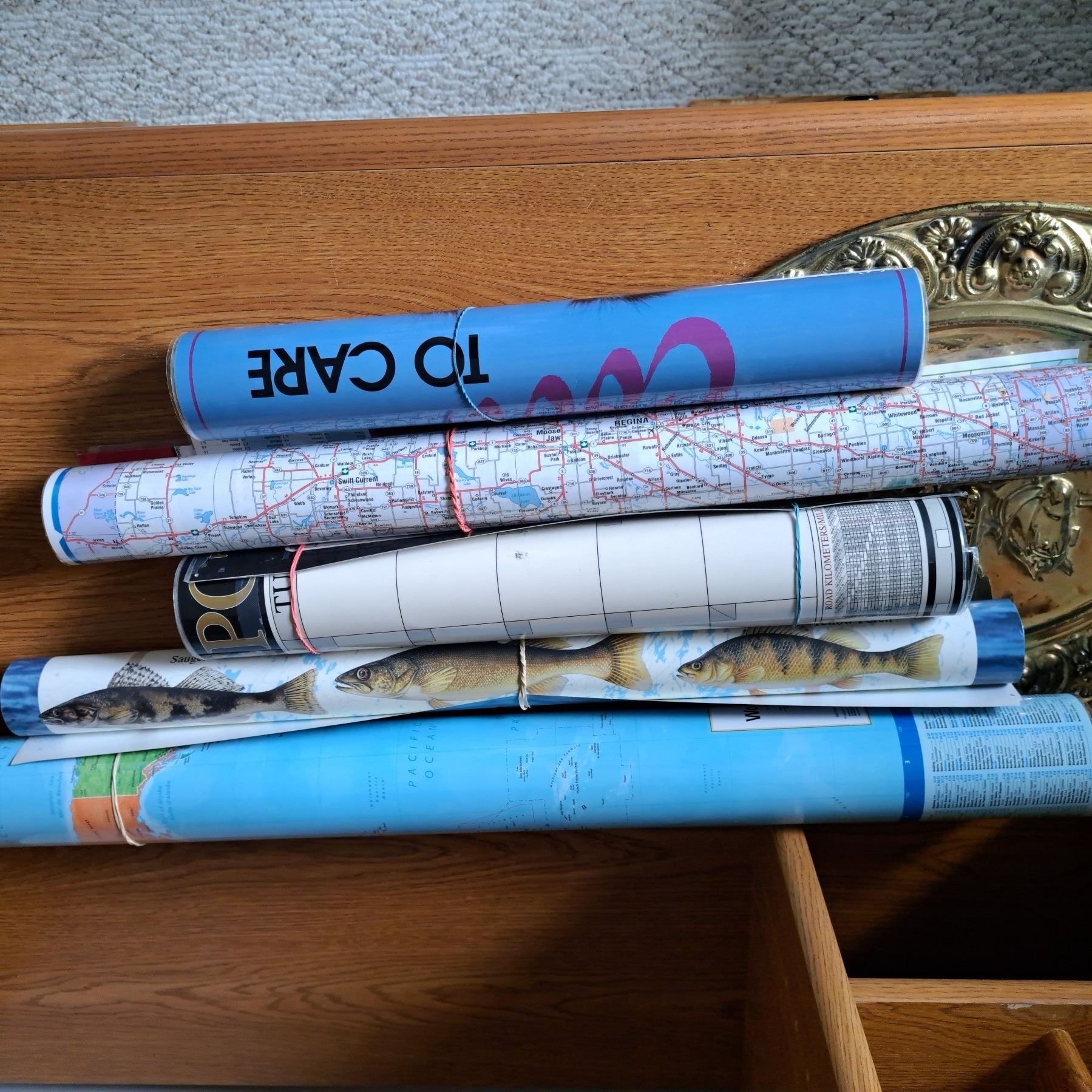 5 maps, Sask, Sask fish, misc. and decorative plate
