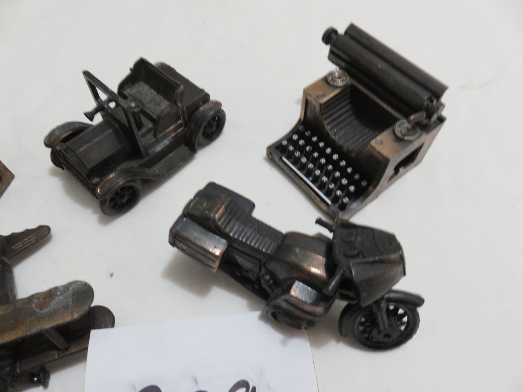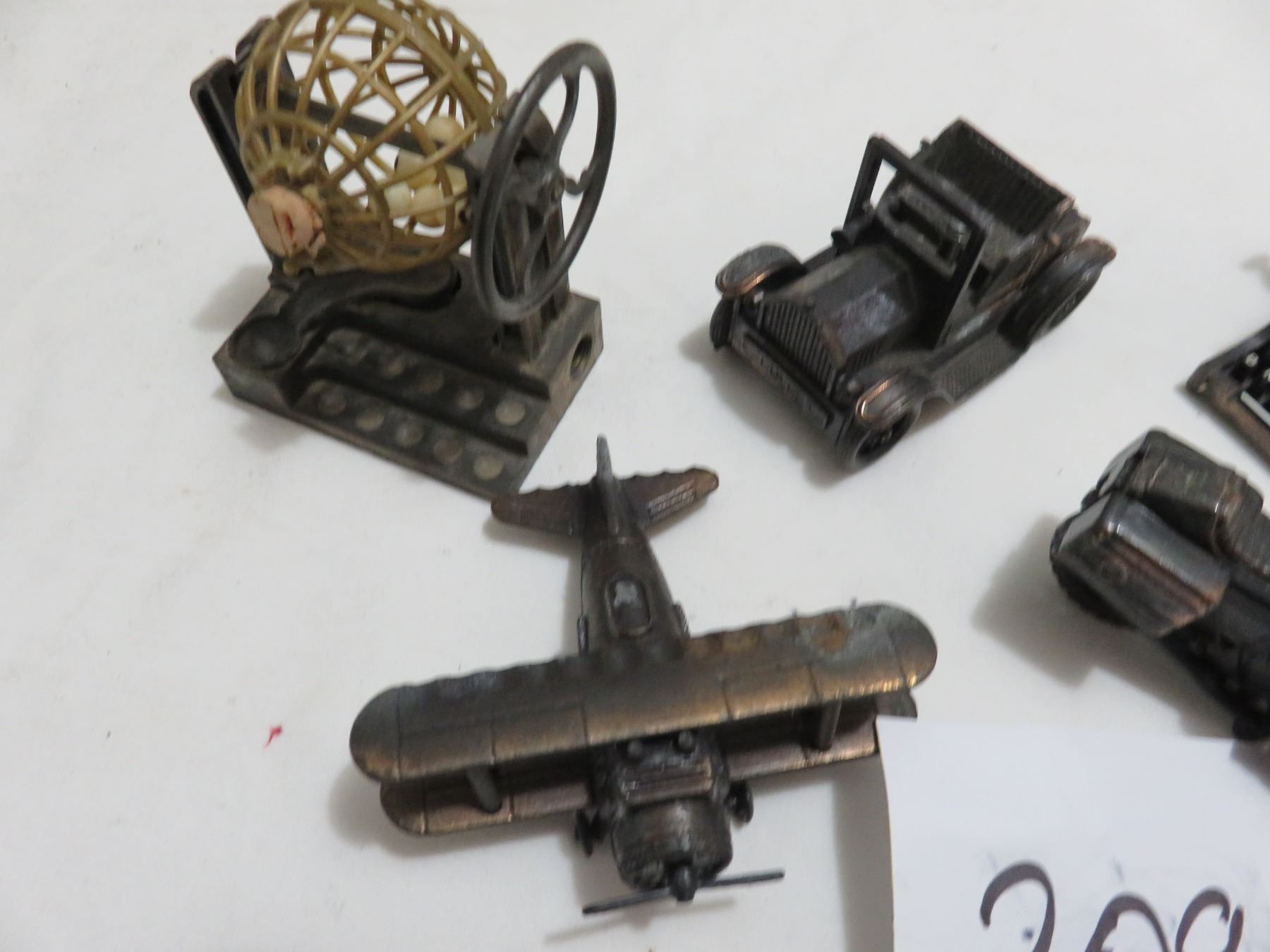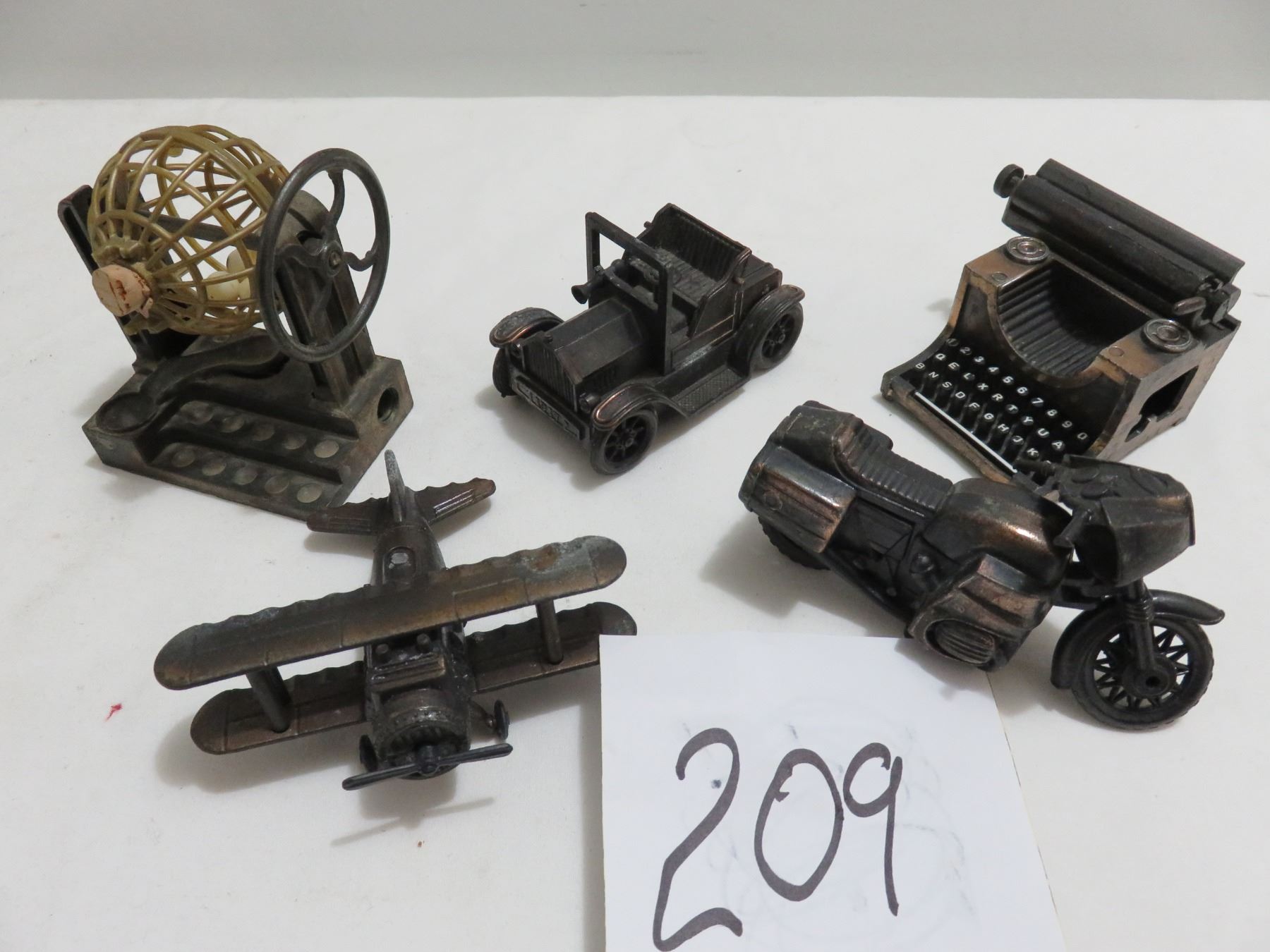5 metal pencil sharpeners, motorcycle, plane, typewriter etc.