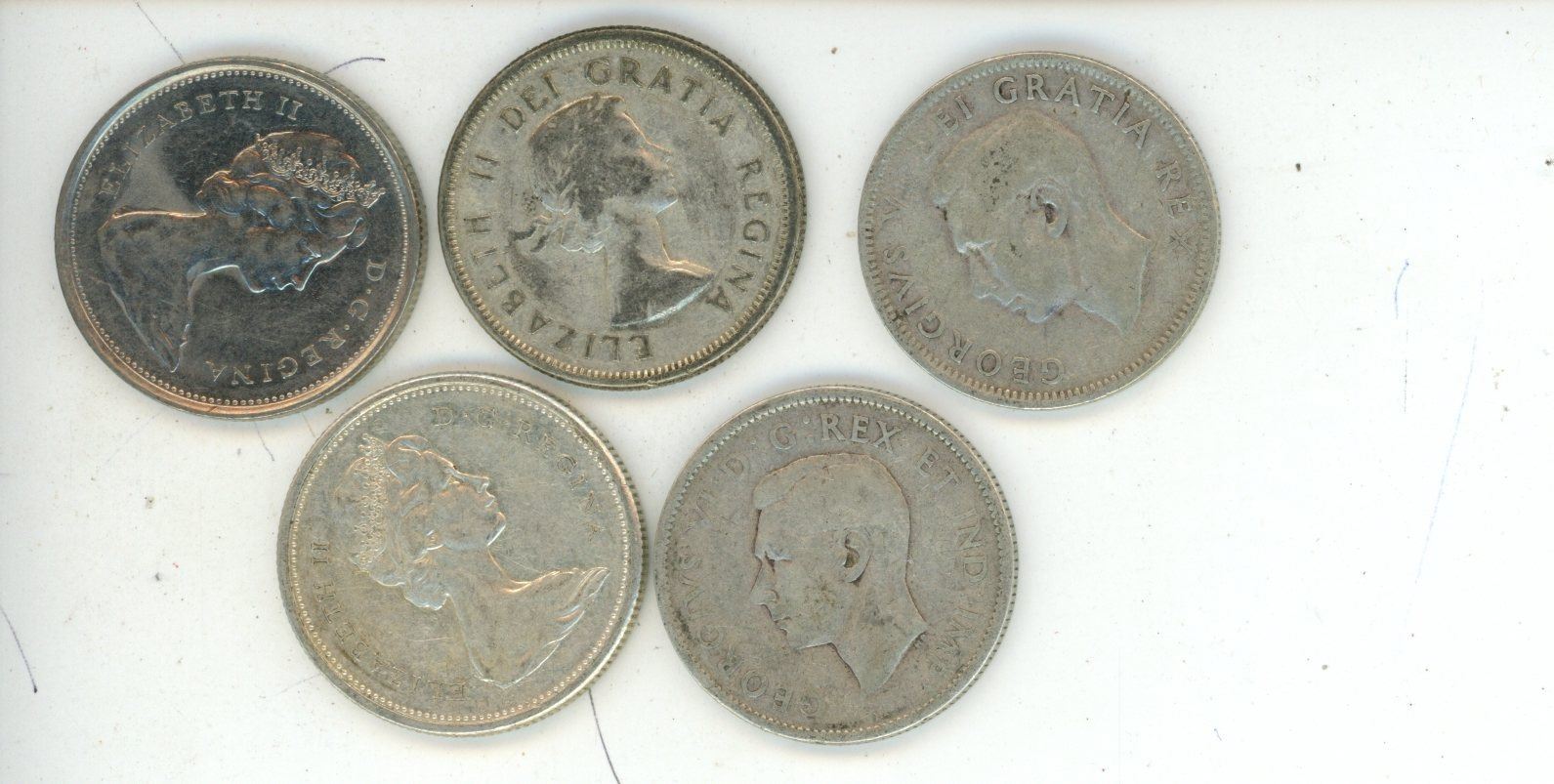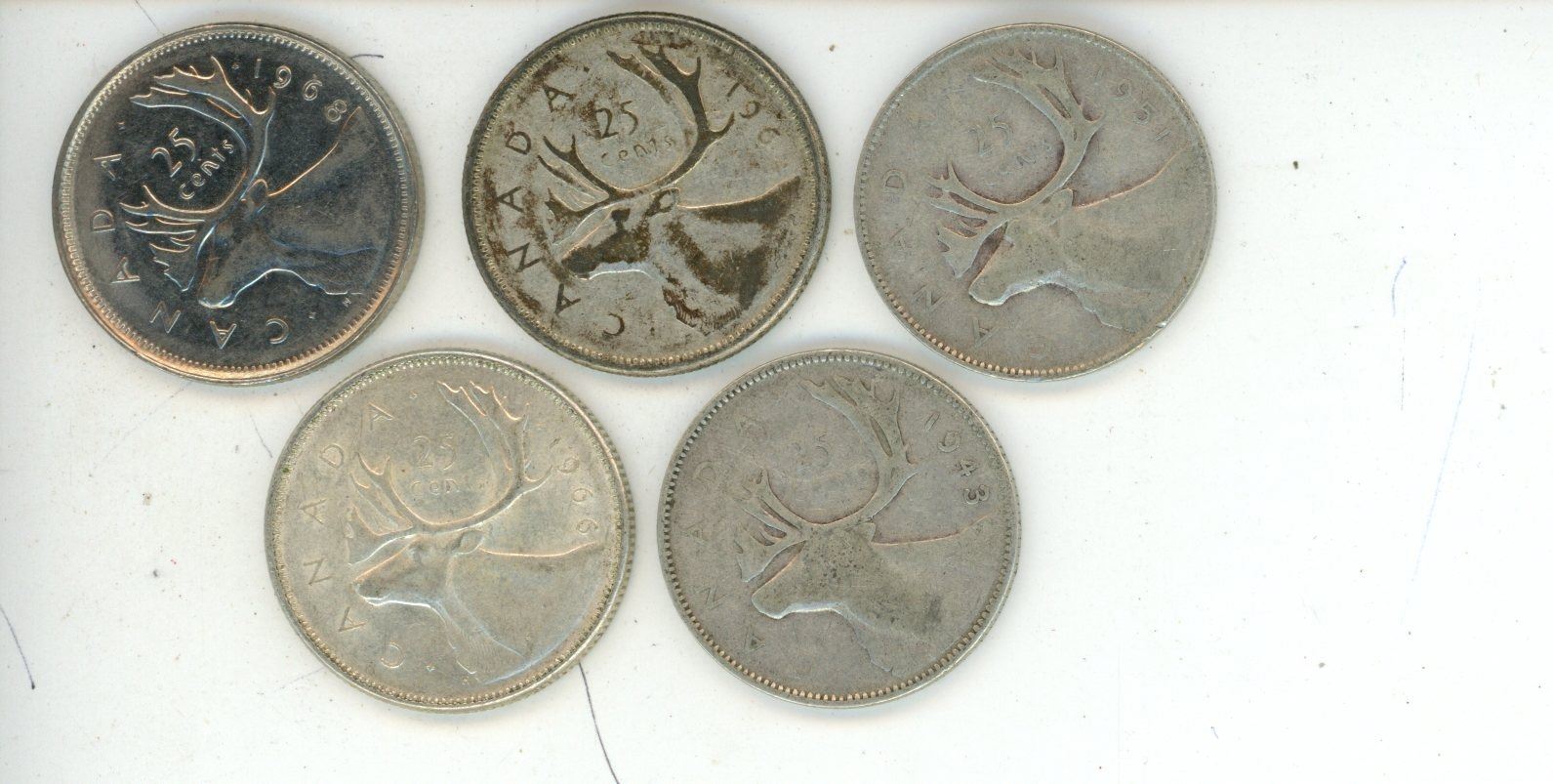 5 silver Canadian Quarters - 1943,1951,1964,1966,1968