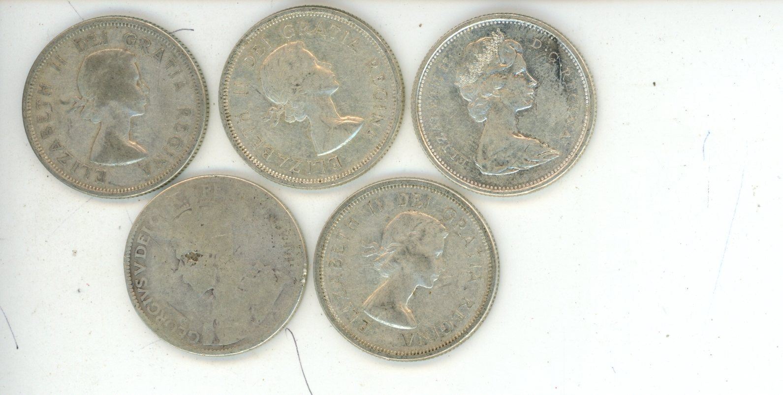 5 silver Canadian Quarters -1959,1964,1867-1965 cougar