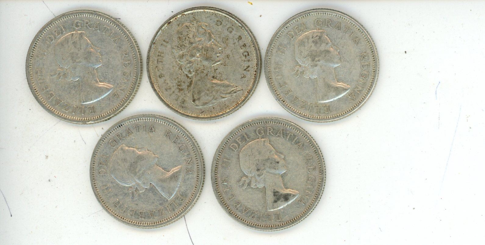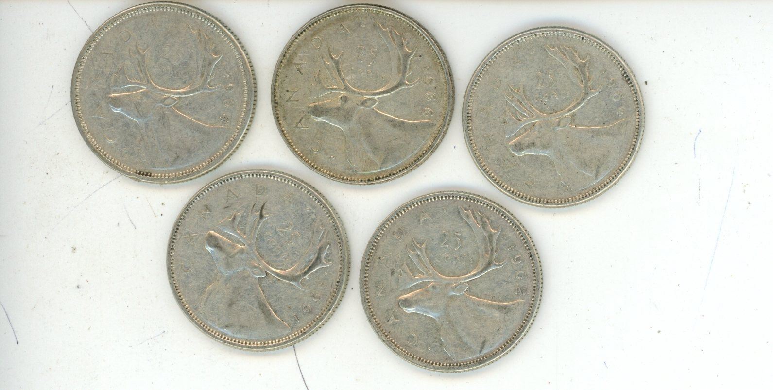 5 silver Canadian Quarters - 1961,1962,1964,1966