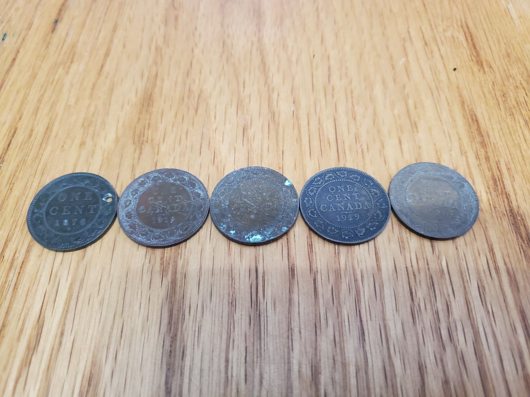 5 x Canada Large Cent 1876 (holed), 1916, 1918, 1919, 1920
