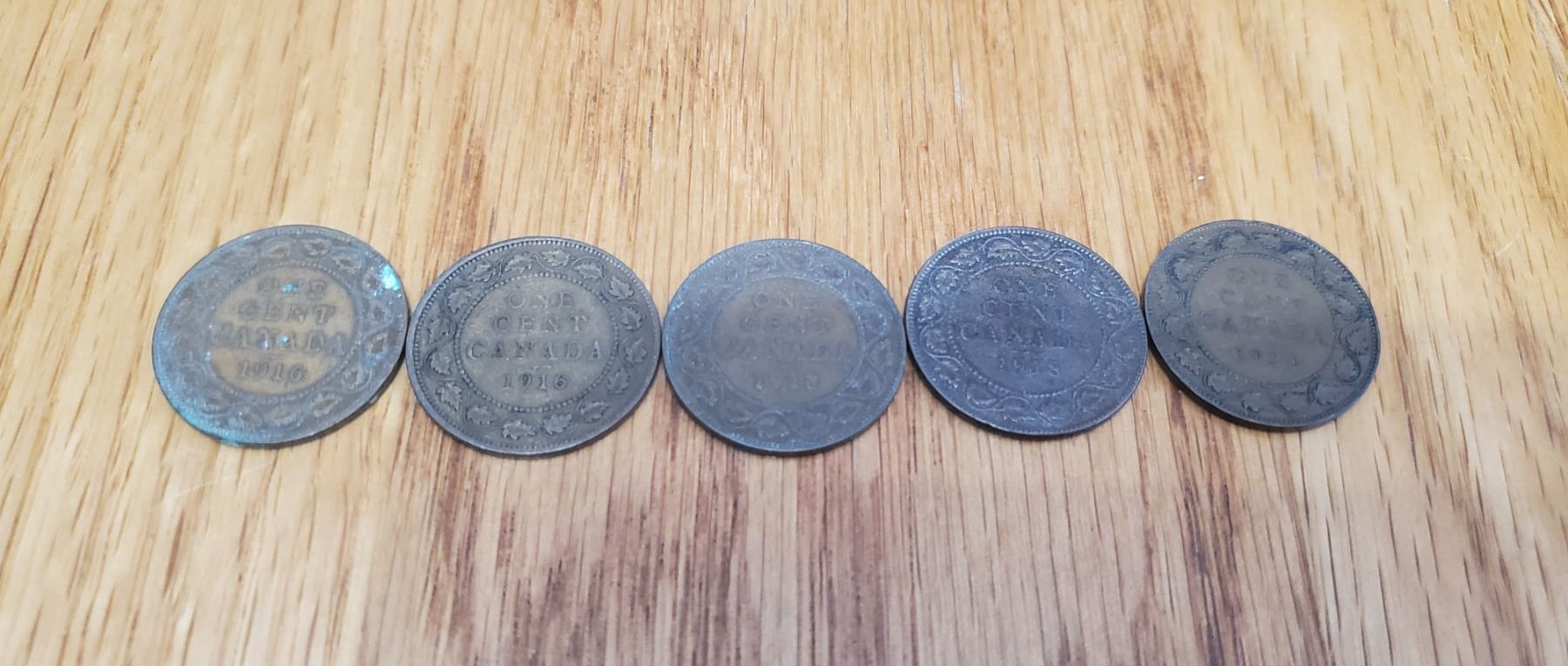 5 x Canada Large Cent 1916, 1916, 1918, 1918, 1920