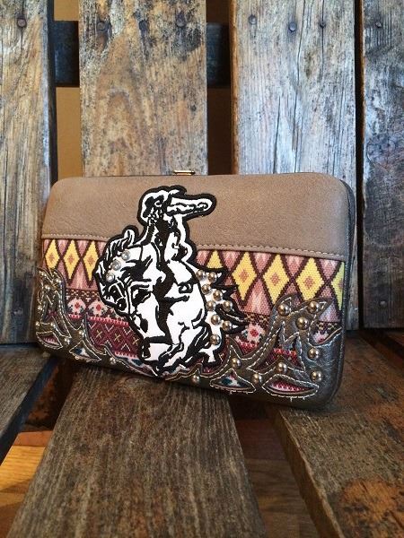 5"x8" BRONZE/BRONC DESIGN DESIGN CLASP CLOSURE WESTERN WALLET-INNER AND OUT ZIP COMPARTMENTS/CREDIT CARD SLOTS