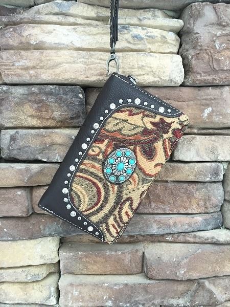 5"x8" BROWN PAISLEY/TOOLED ZIPPERED WESTERN WALLET-DETACHABLE STRAP/INNER AND OUT ZIP COMPARTMENTS/CREDIT CARD SLOTS