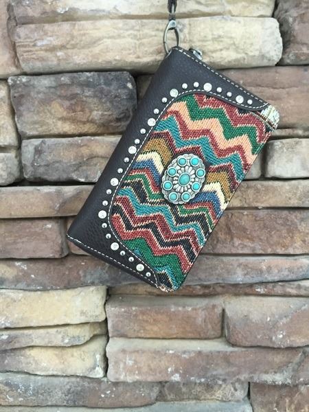5"x8" COFFEE BROWN/AZTEC DESIGN ZIPPERED WESTERN WALLET-DETACHABLE STRAP/INNER AND OUT ZIP COMPARTMENTS/CREDIT CARD SLOTS