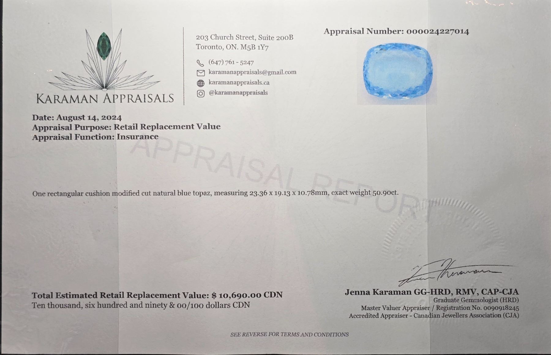 50.9 ct certified swiss blue topaz gemstone (10,690 appraisal)