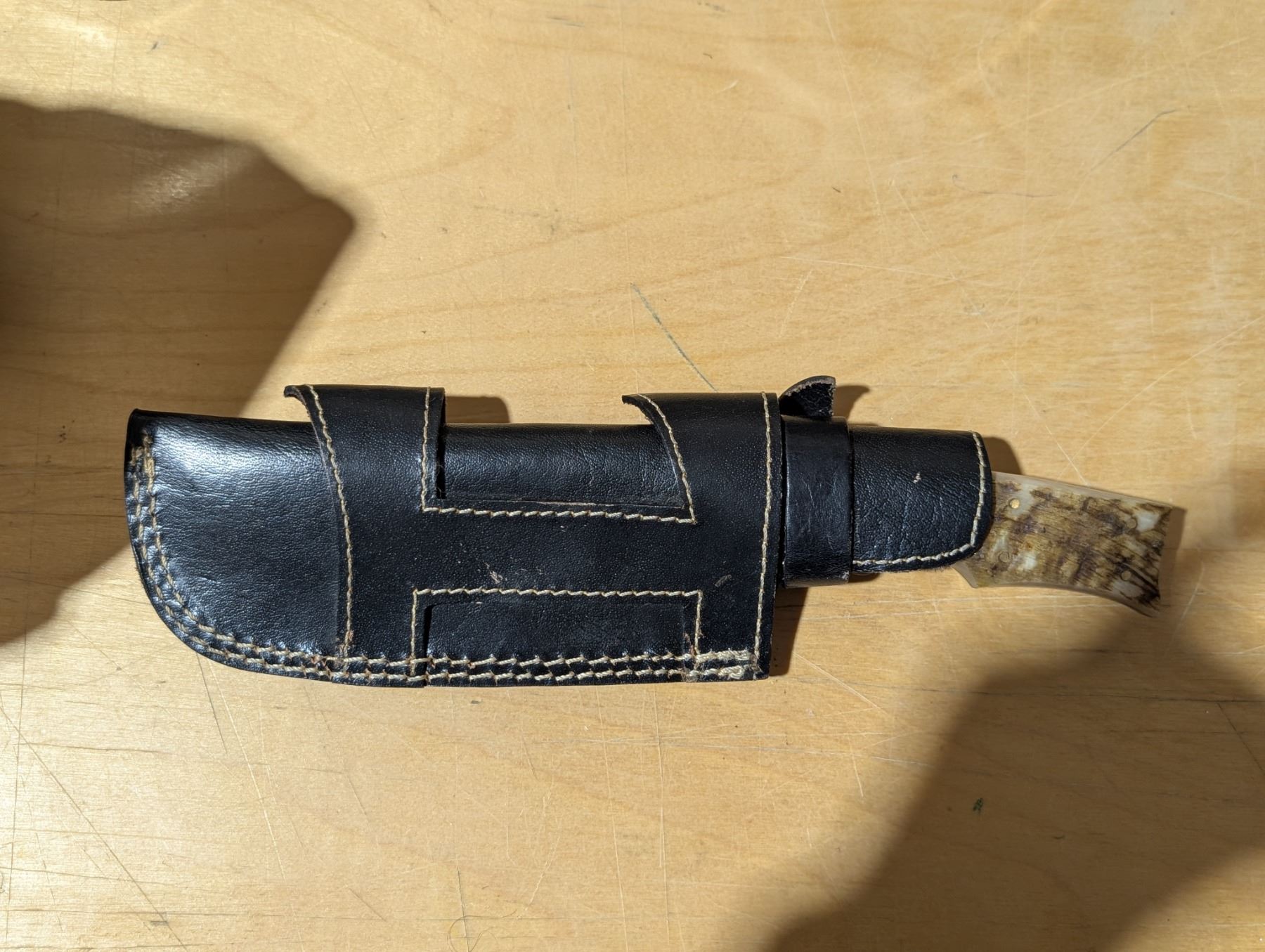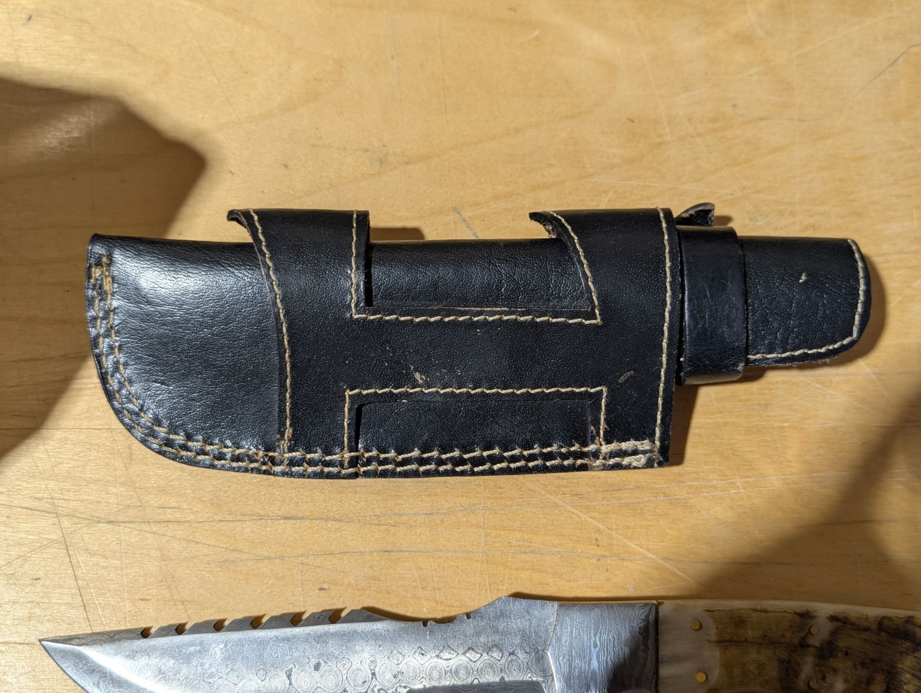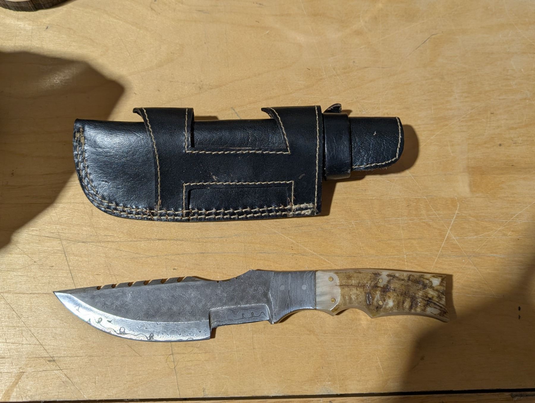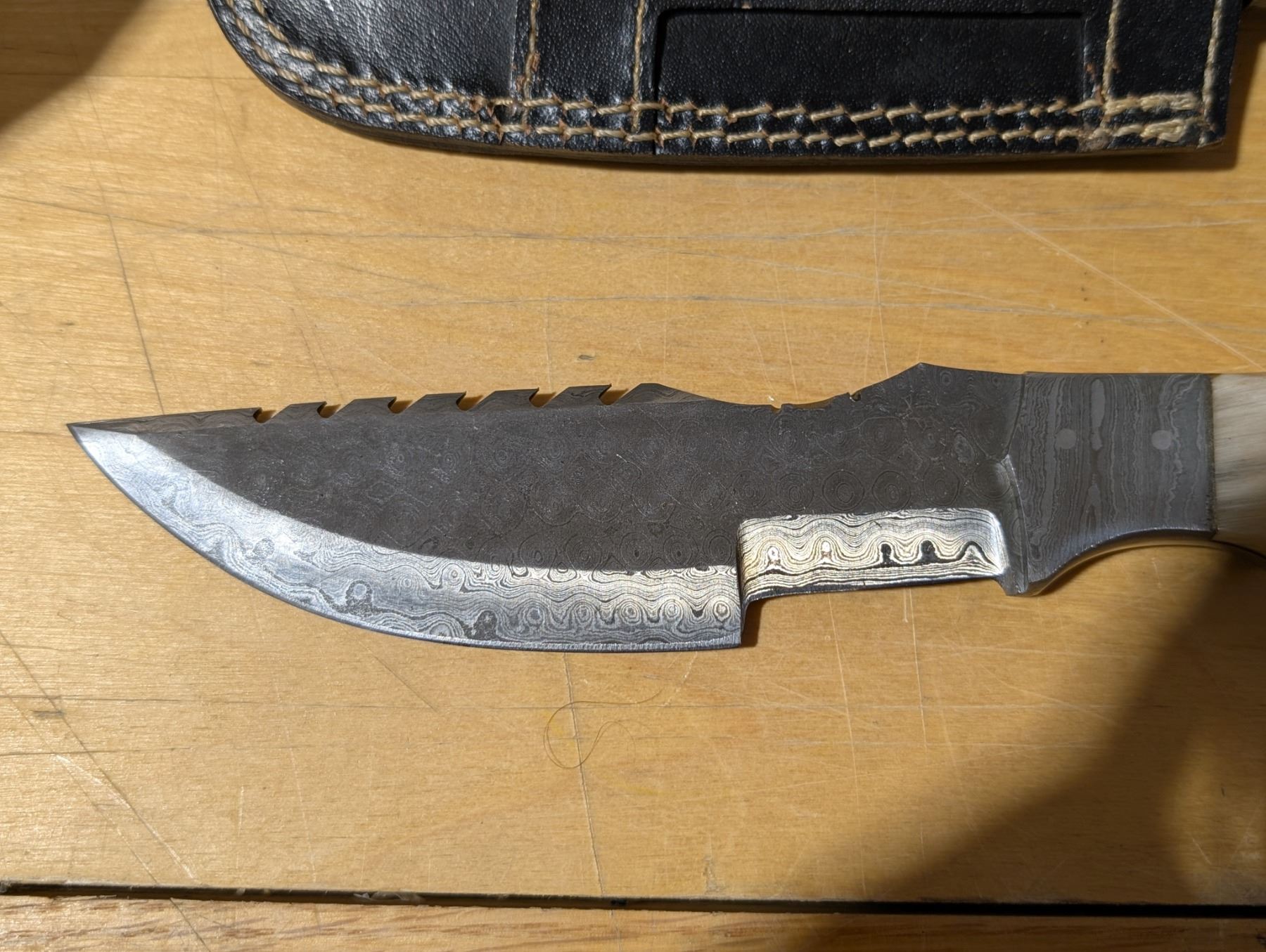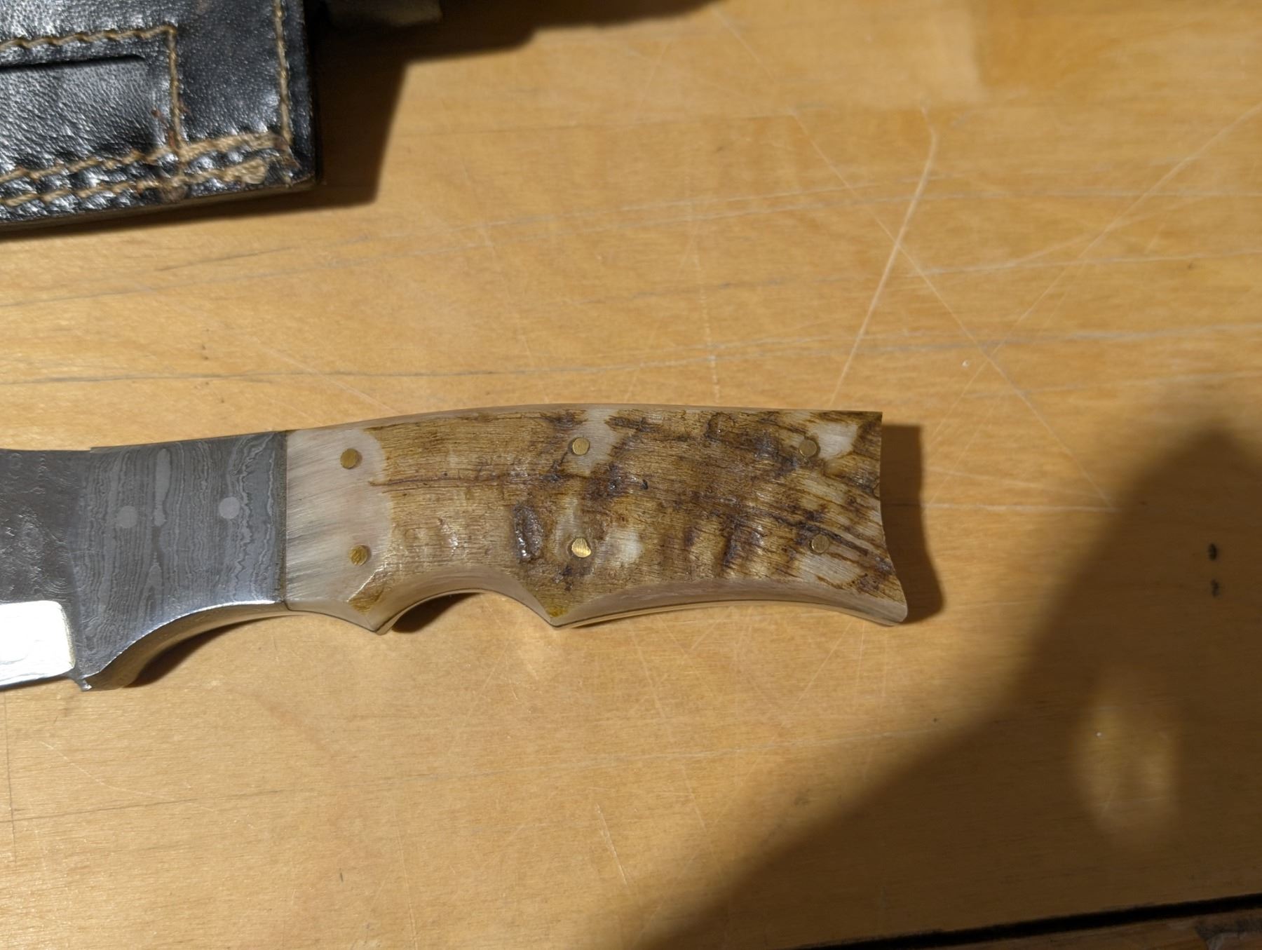 512 Layer Damascus Steel w/ Rams Horn Grips Sideways on Straight Sheaf