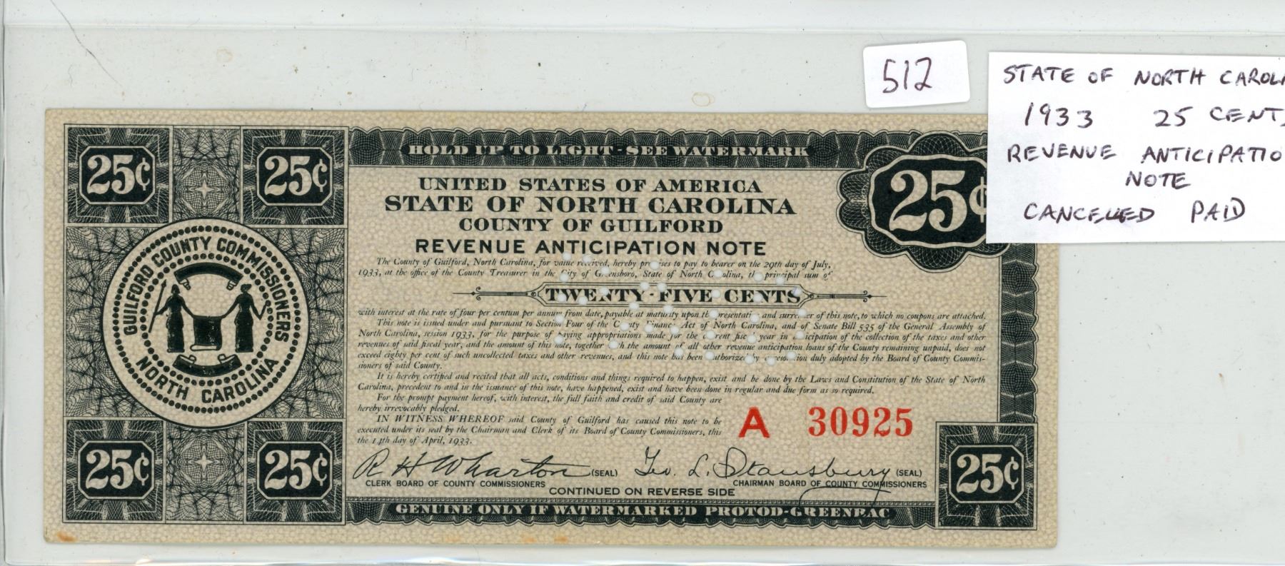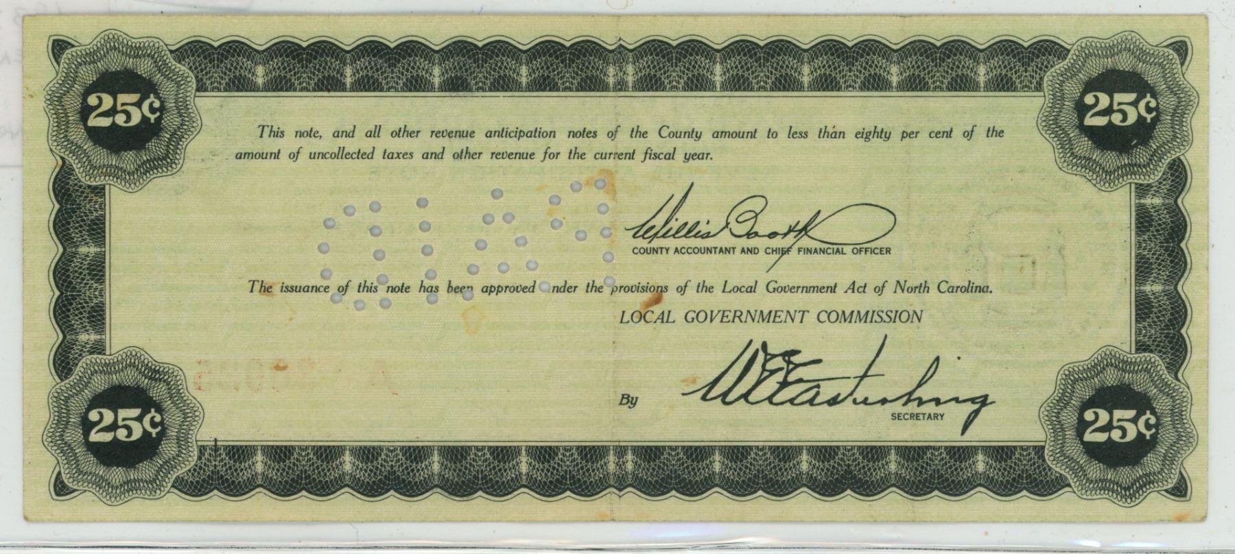 State of North Carolina 1933 25 Cents Revenue Anticipation Note. Punch Cancelled PAID. VF+.