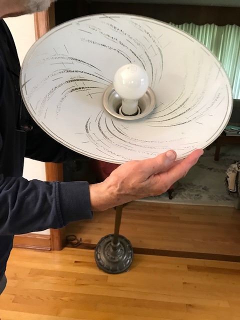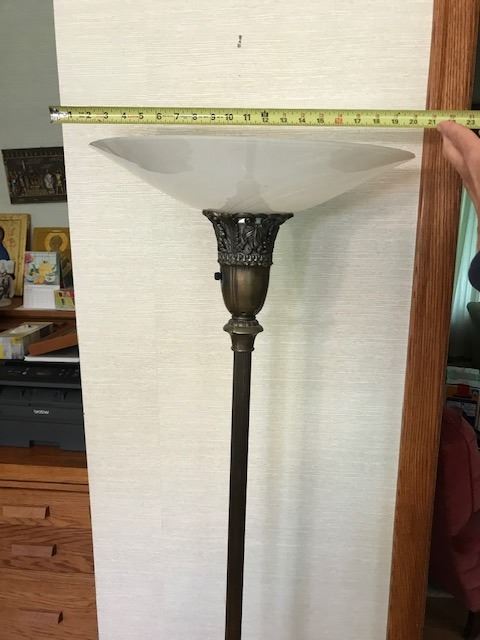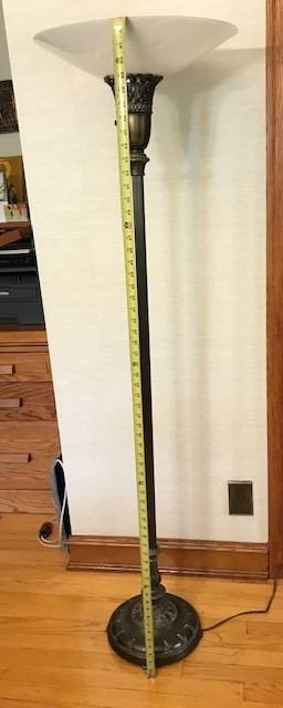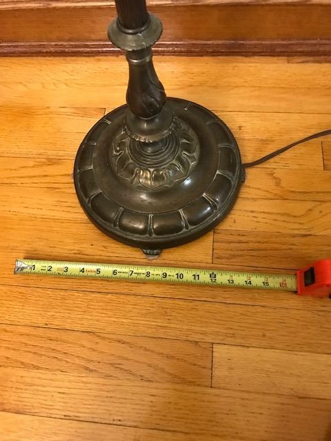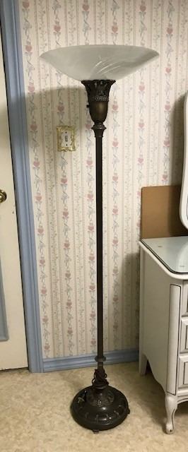 #531: Antique brass lamp with newer glass shade. 63” (160 cm) high. Base 11” (28 cm) wide. Lamp shade 18” wide. Very good condition. Works. Bulb burnt out.