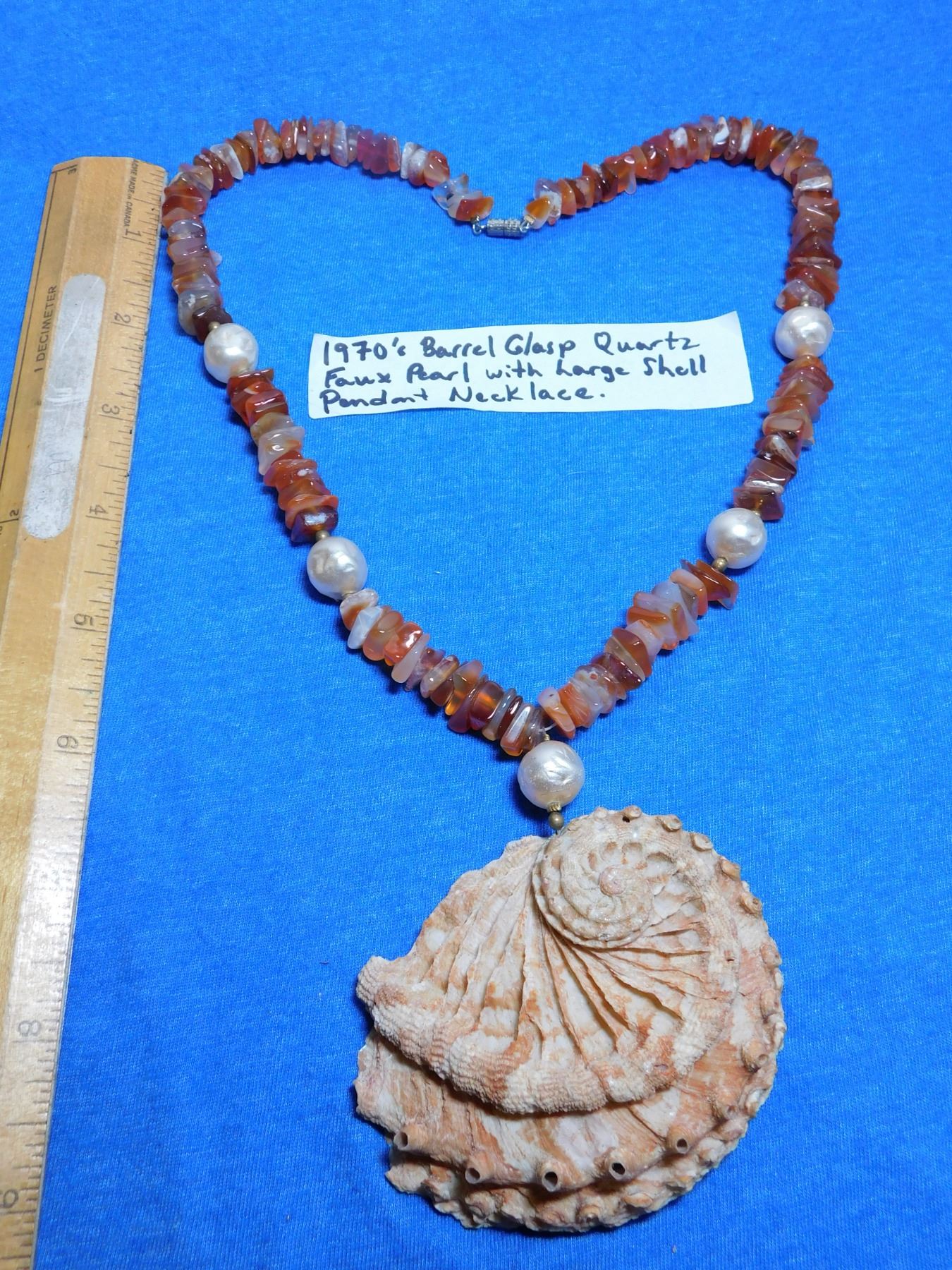 583. 1970’s barrel clasp quartz, faux pearl large shell pendent necklace