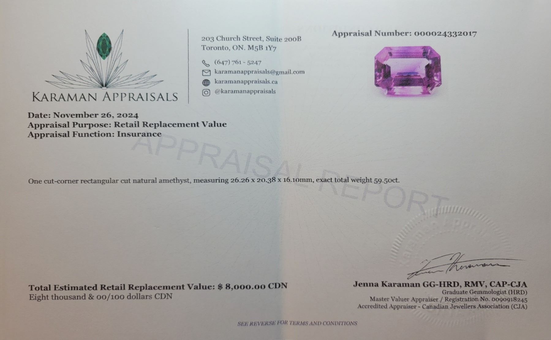 59.5 ct certified amethyst gemstone ($8,000 appraisal)