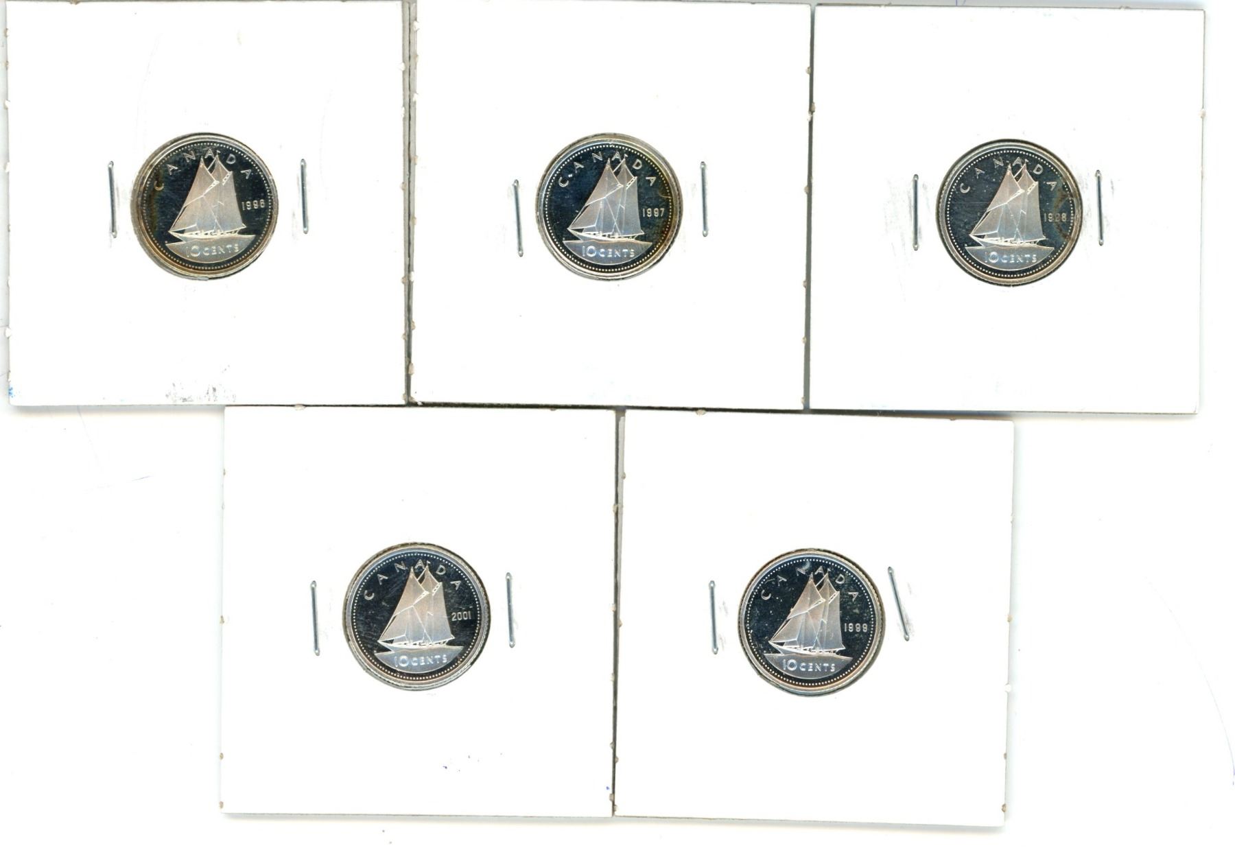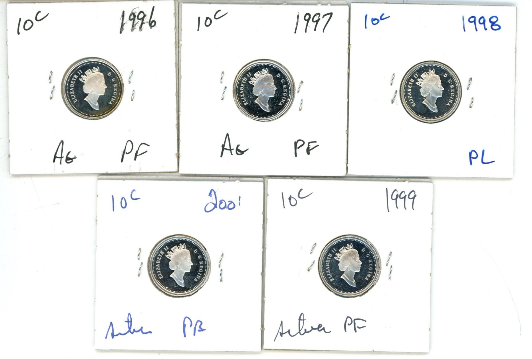 5x Canadian silver proof 10 cent coins - 1996-99, 2001 - non magnetic