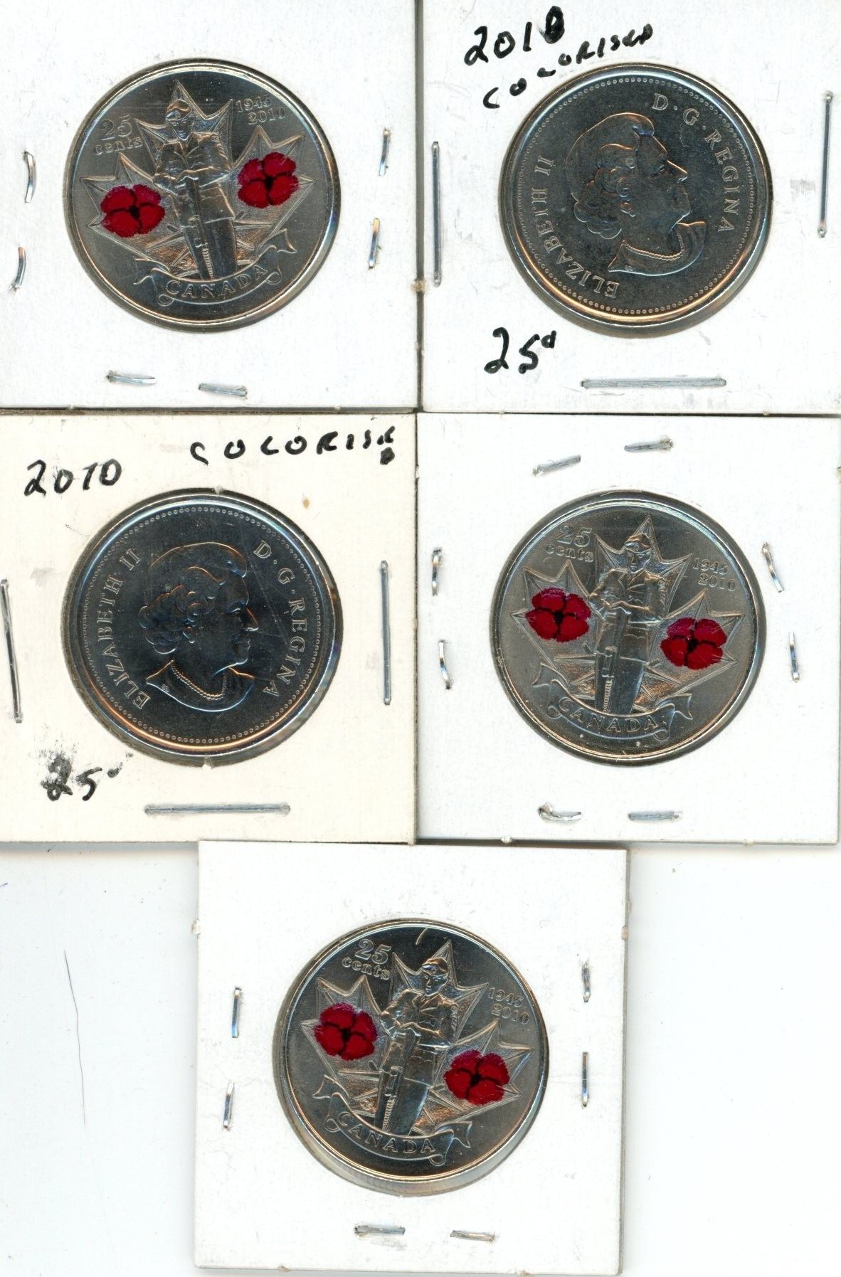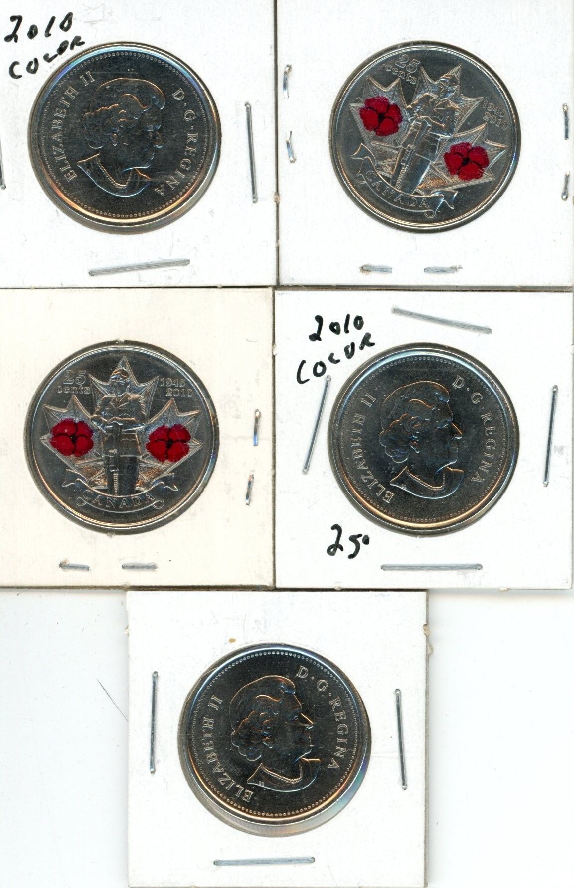 5x2010 25 cent coins 1945-2010 colored
