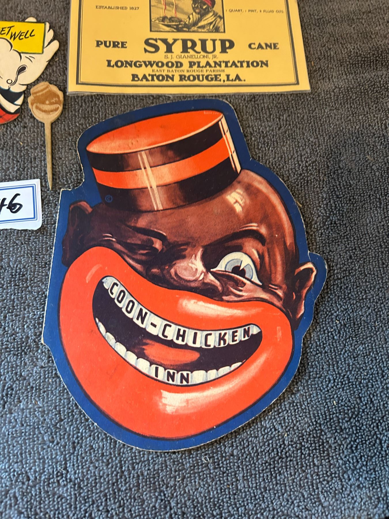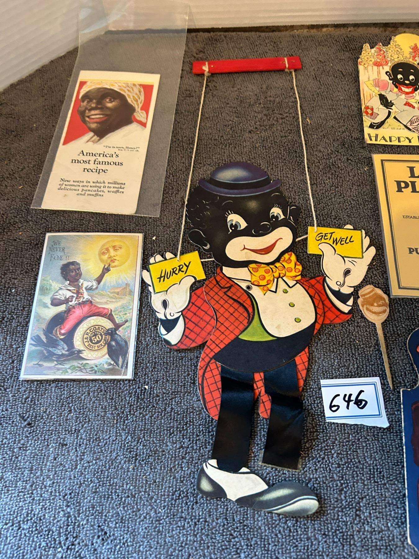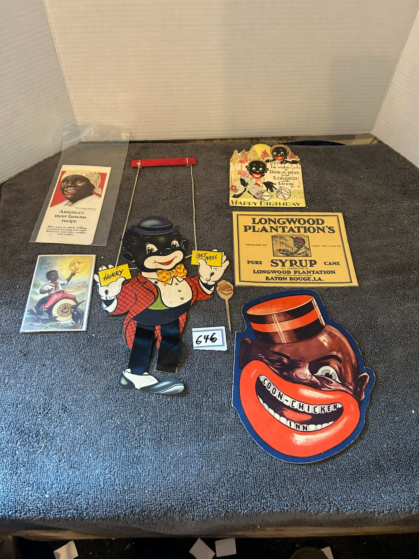 6 Black americana advertising pieces - hand puppets , menu cards, etc