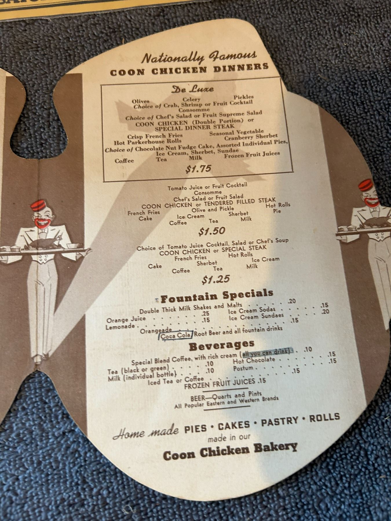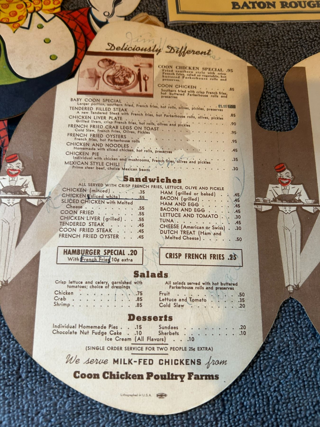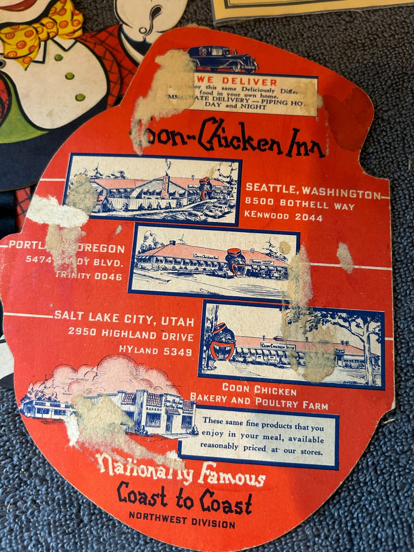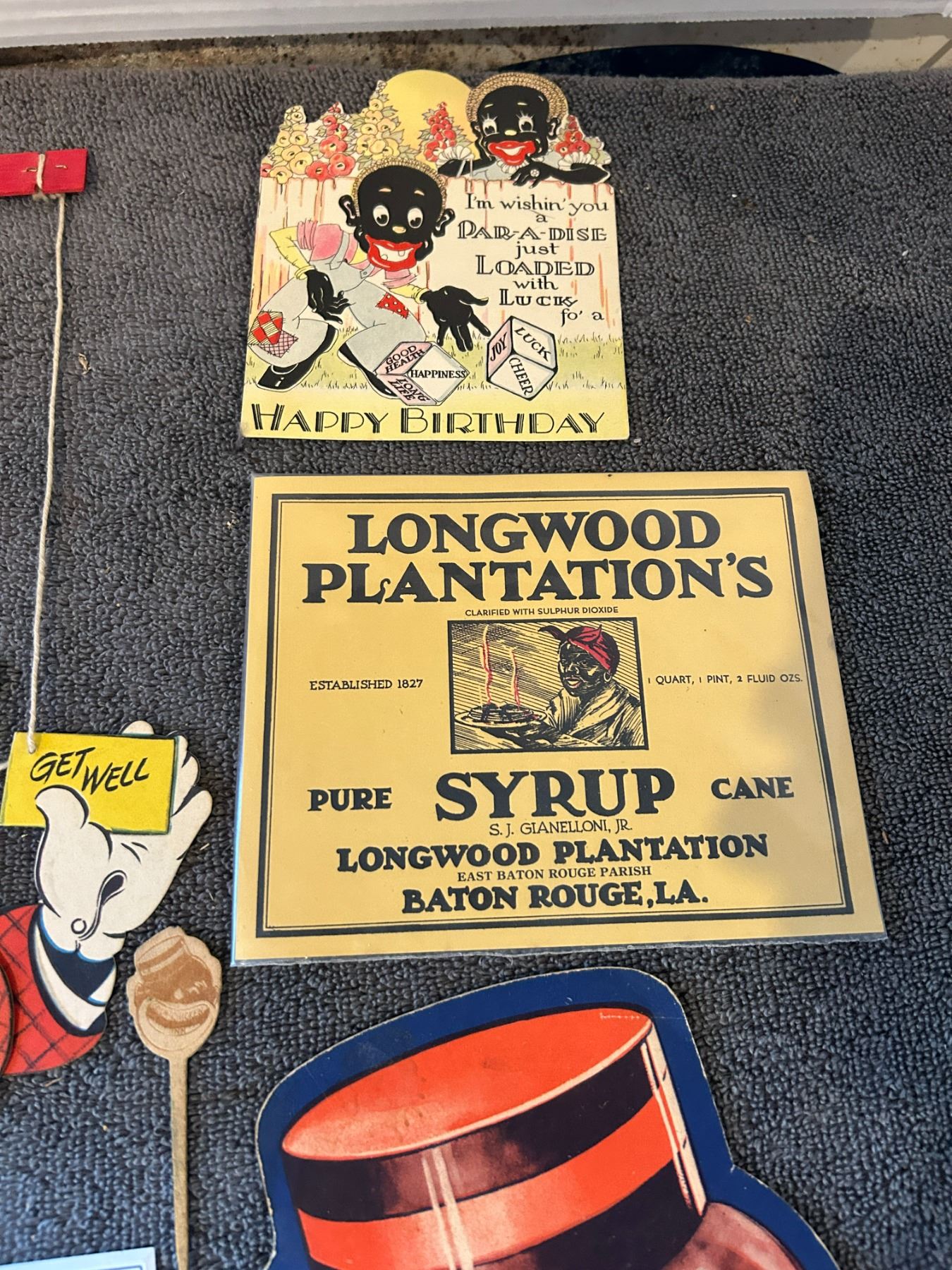 6 Black americana advertising pieces - hand puppets , menu cards, etc