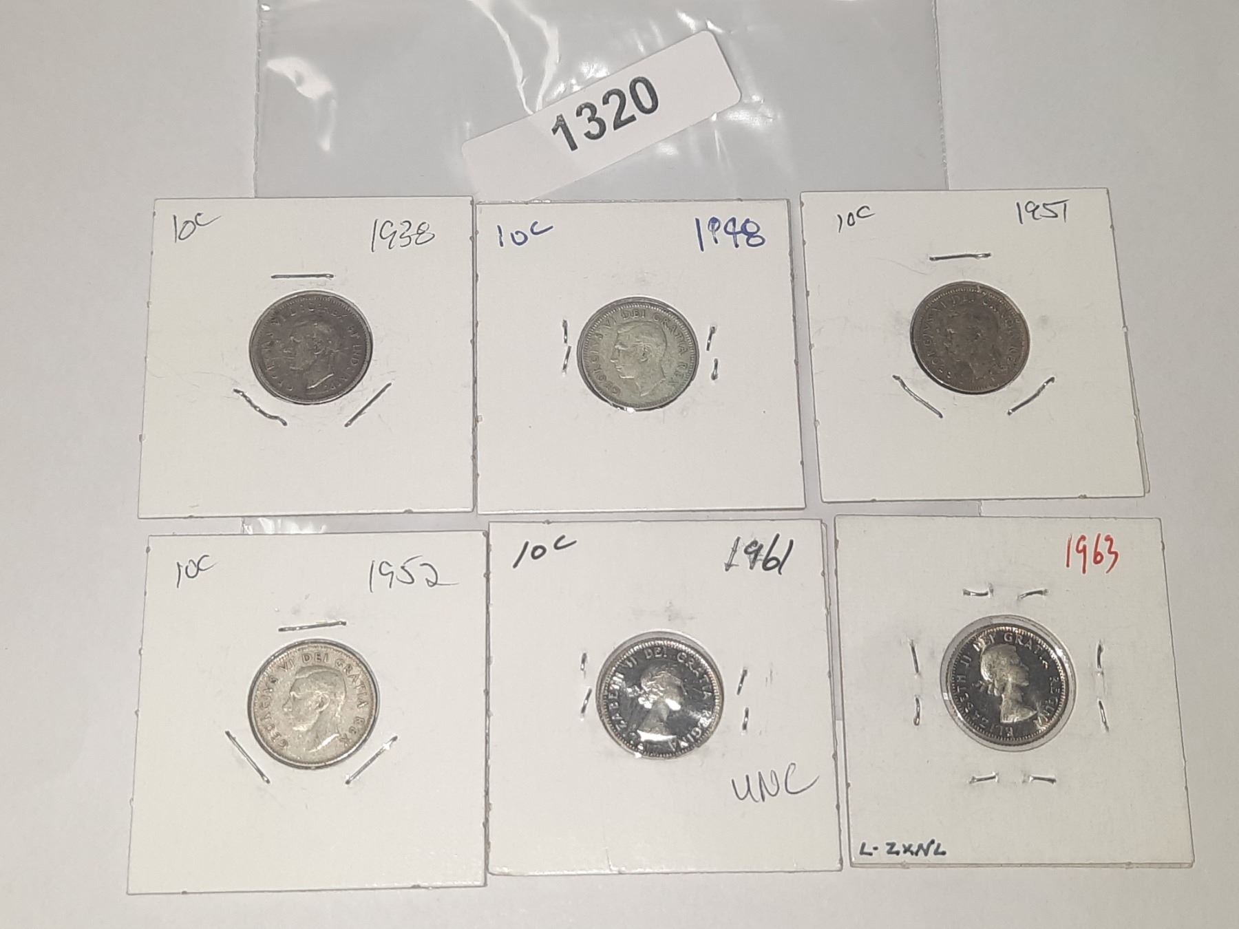 6 - CDN SILVER DIMES 1938,48,51,52, 61&63-UNC