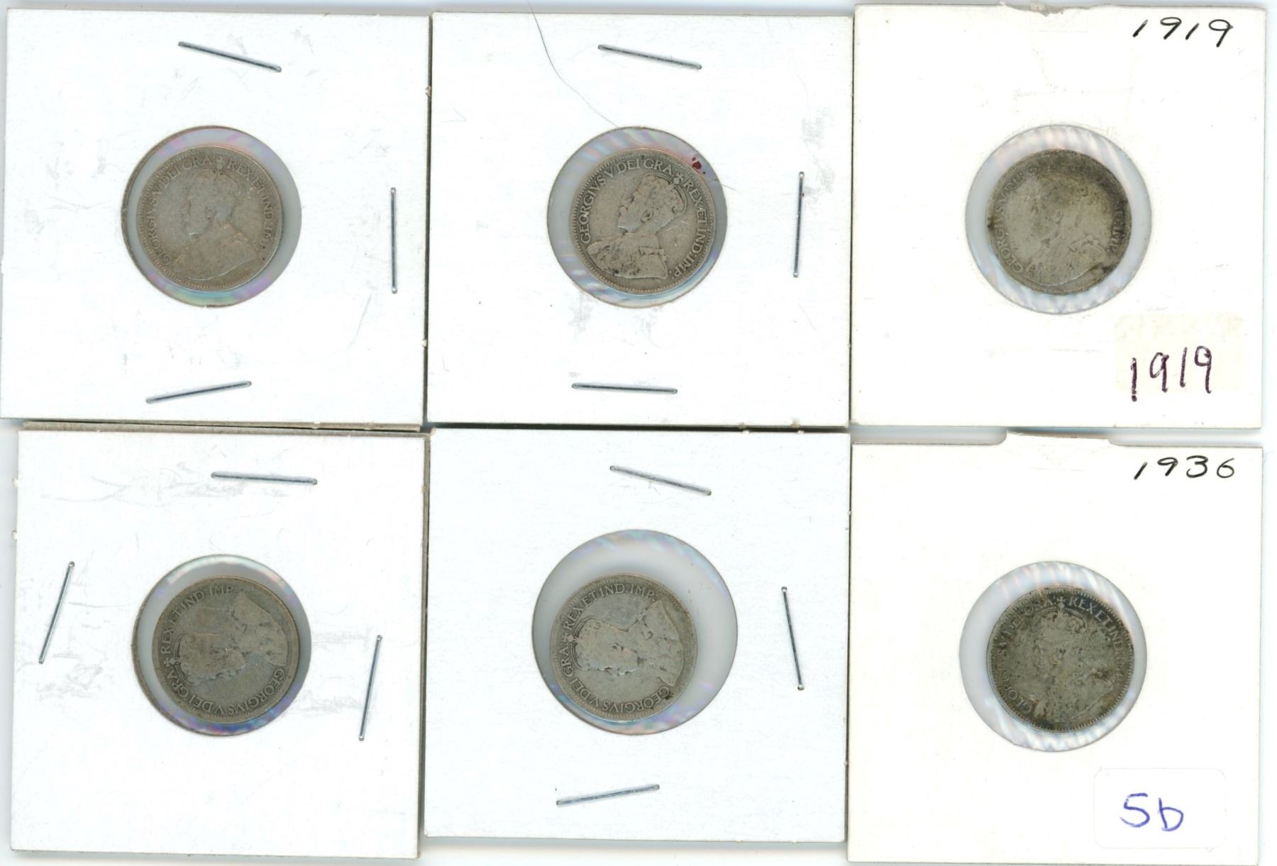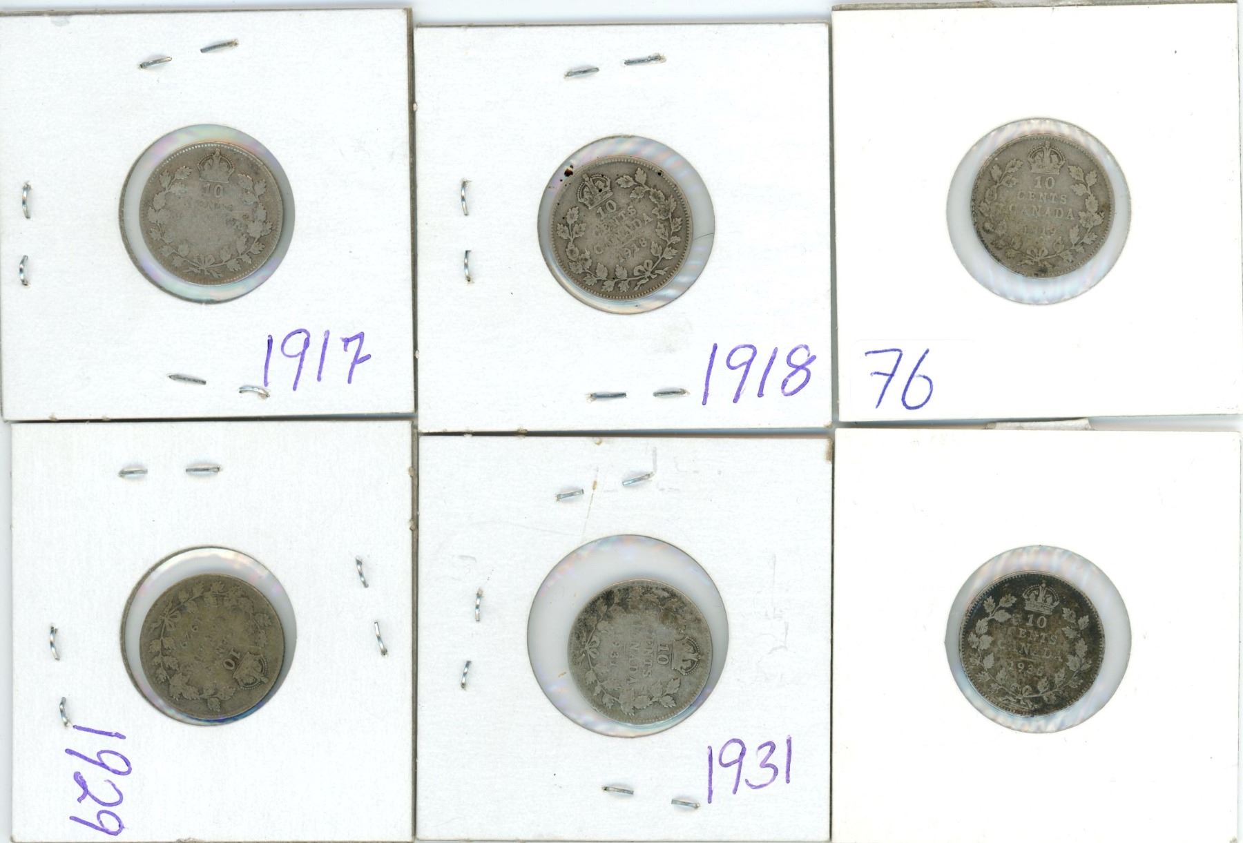 6 Cdn silver small 10¢ coins - 1917, 1918, 1919, 1929, 1931, 1936