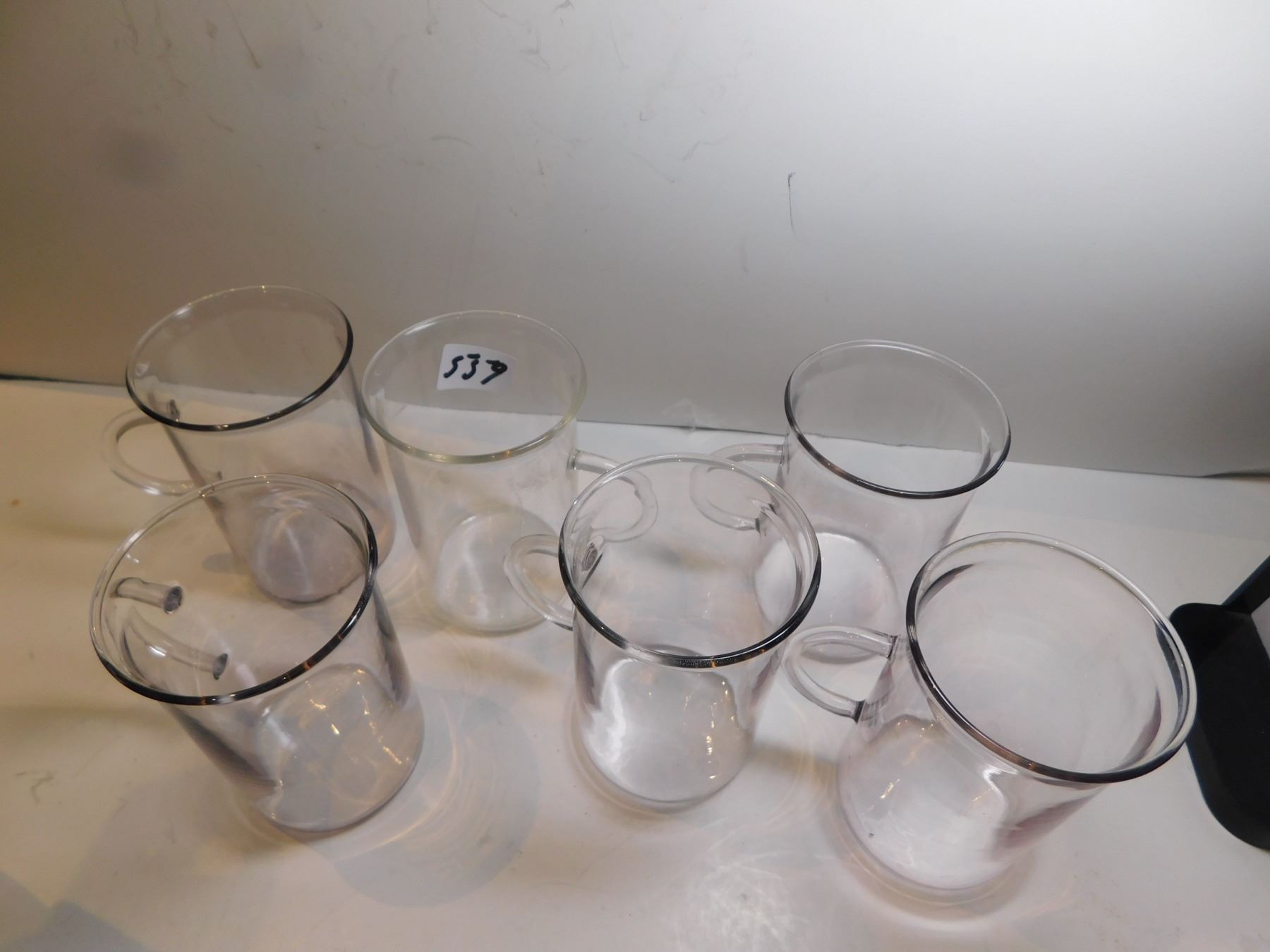 6-DELICATE CUPS WITH HANDLES 5 PURPLE HUE ONE CLEAR