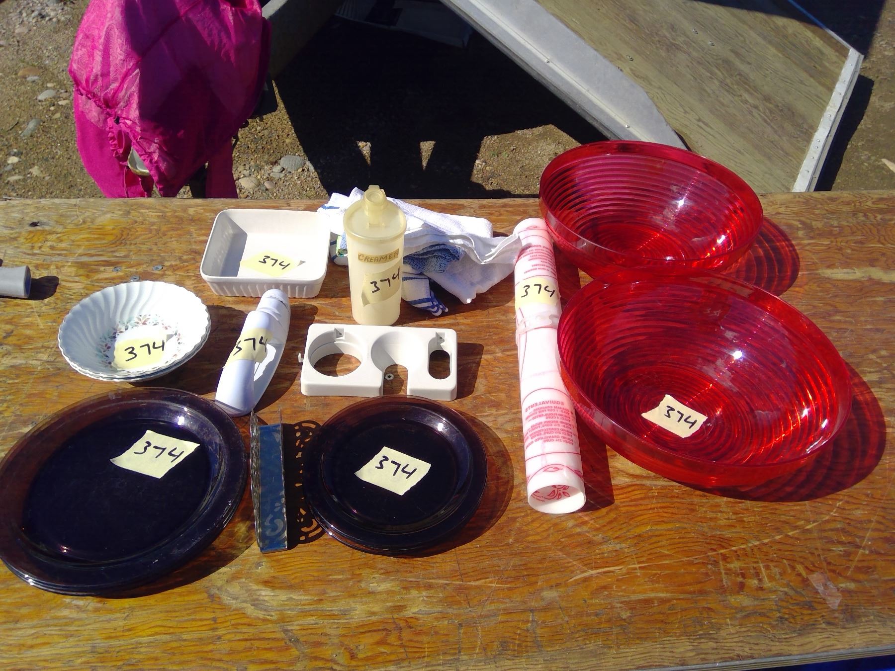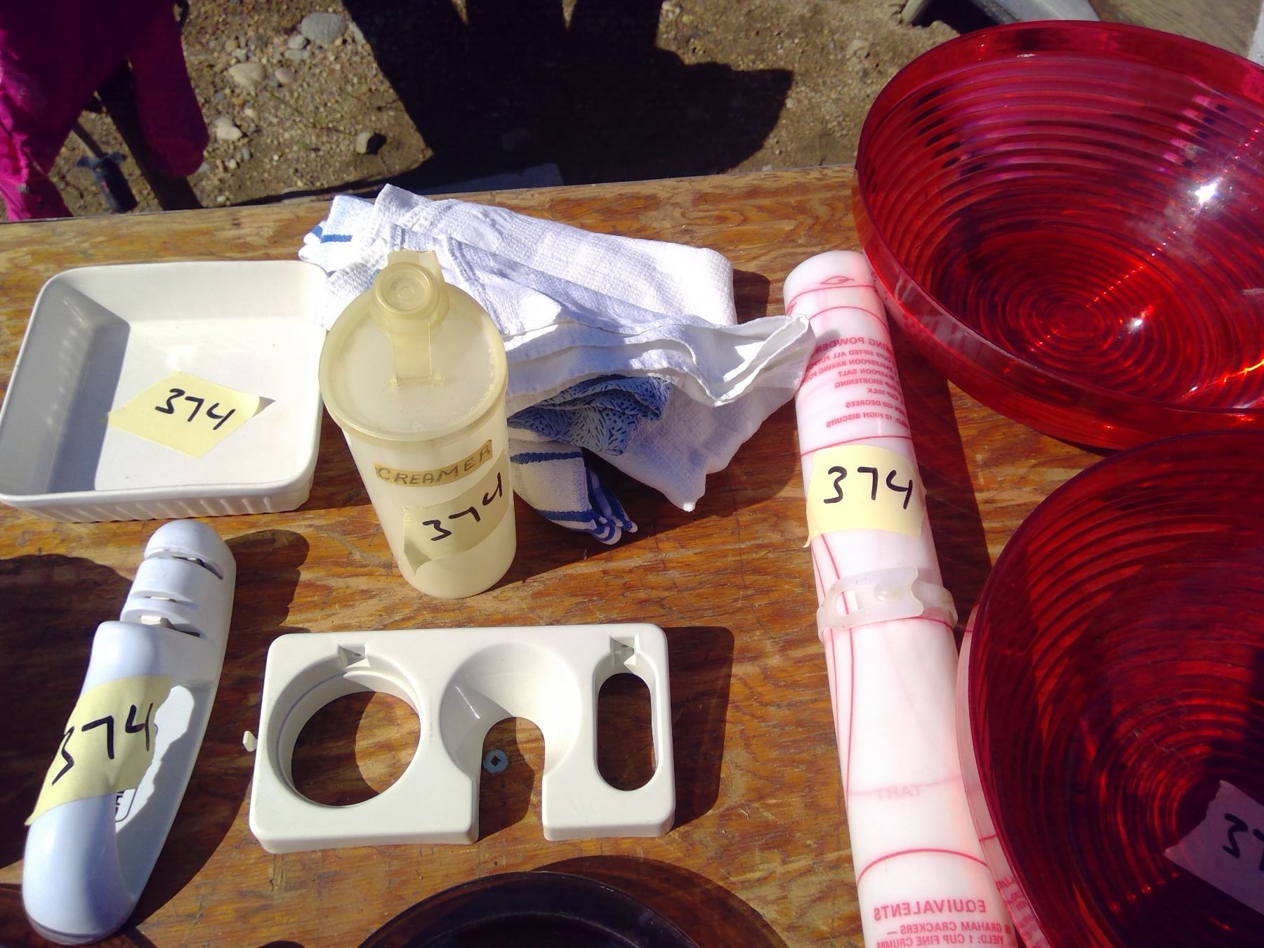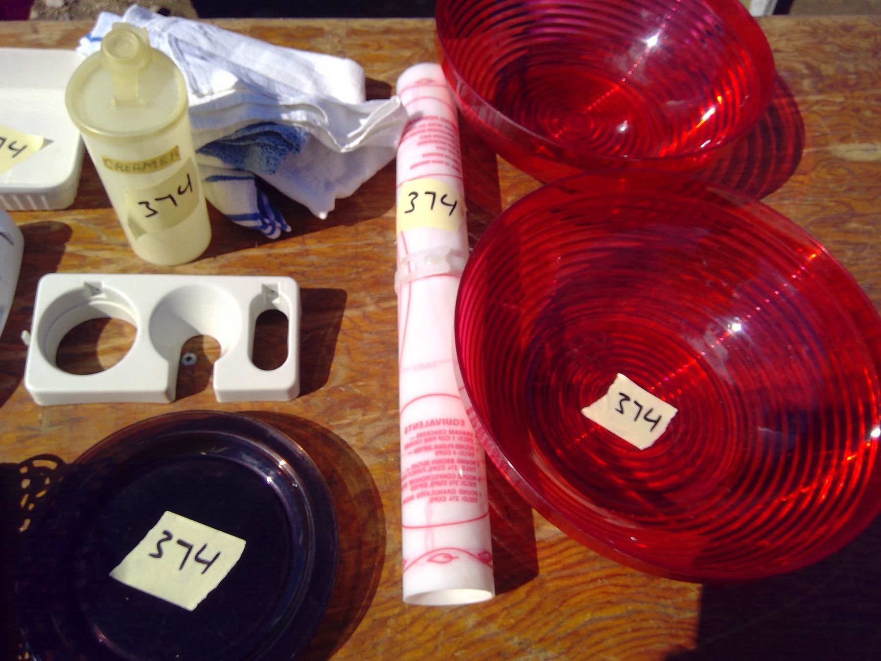 6 PLATES+ NAPKIN HOLDER+BOWLS+2 RED PLASTIC BOWLS+ TEA TOWELS