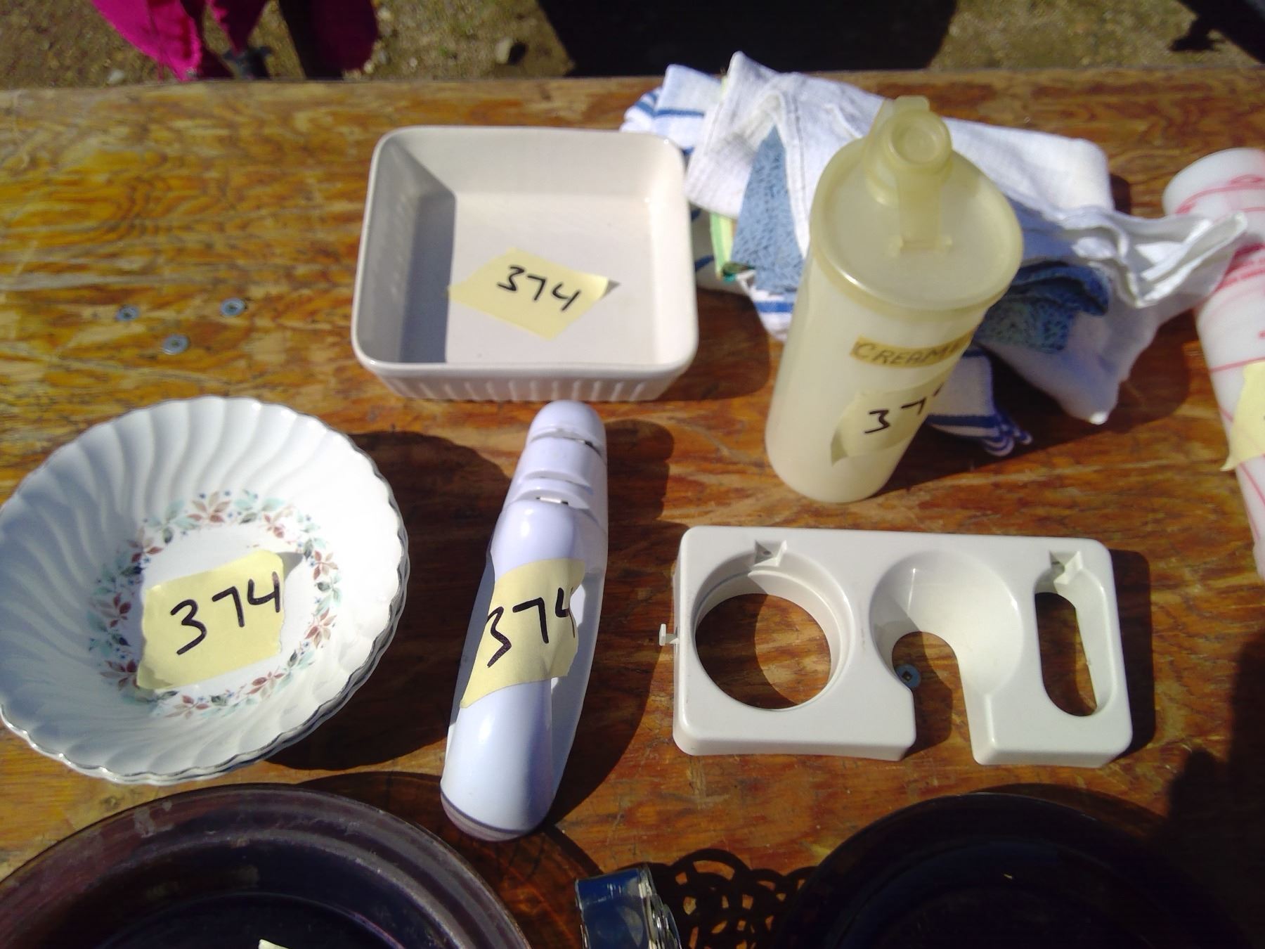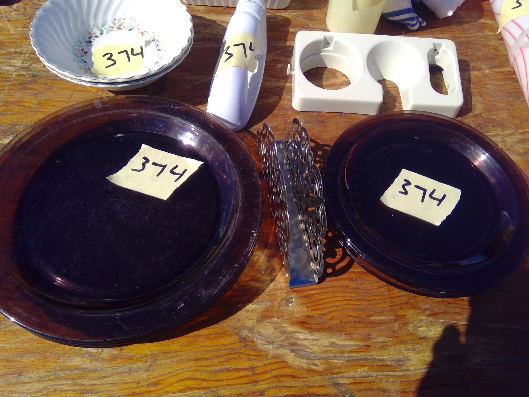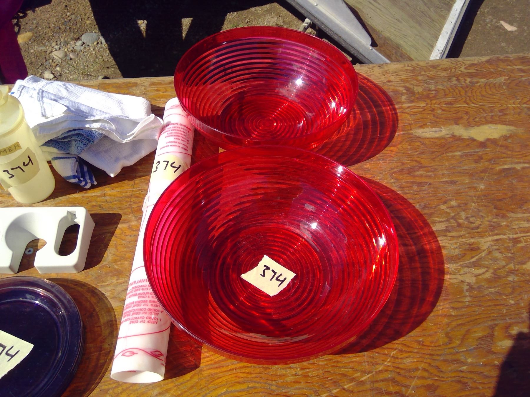 6 PLATES+ NAPKIN HOLDER+BOWLS+2 RED PLASTIC BOWLS+ TEA TOWELS