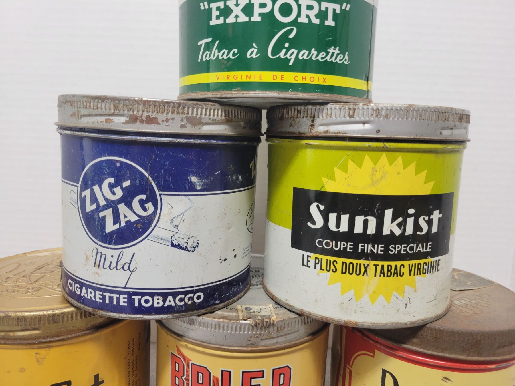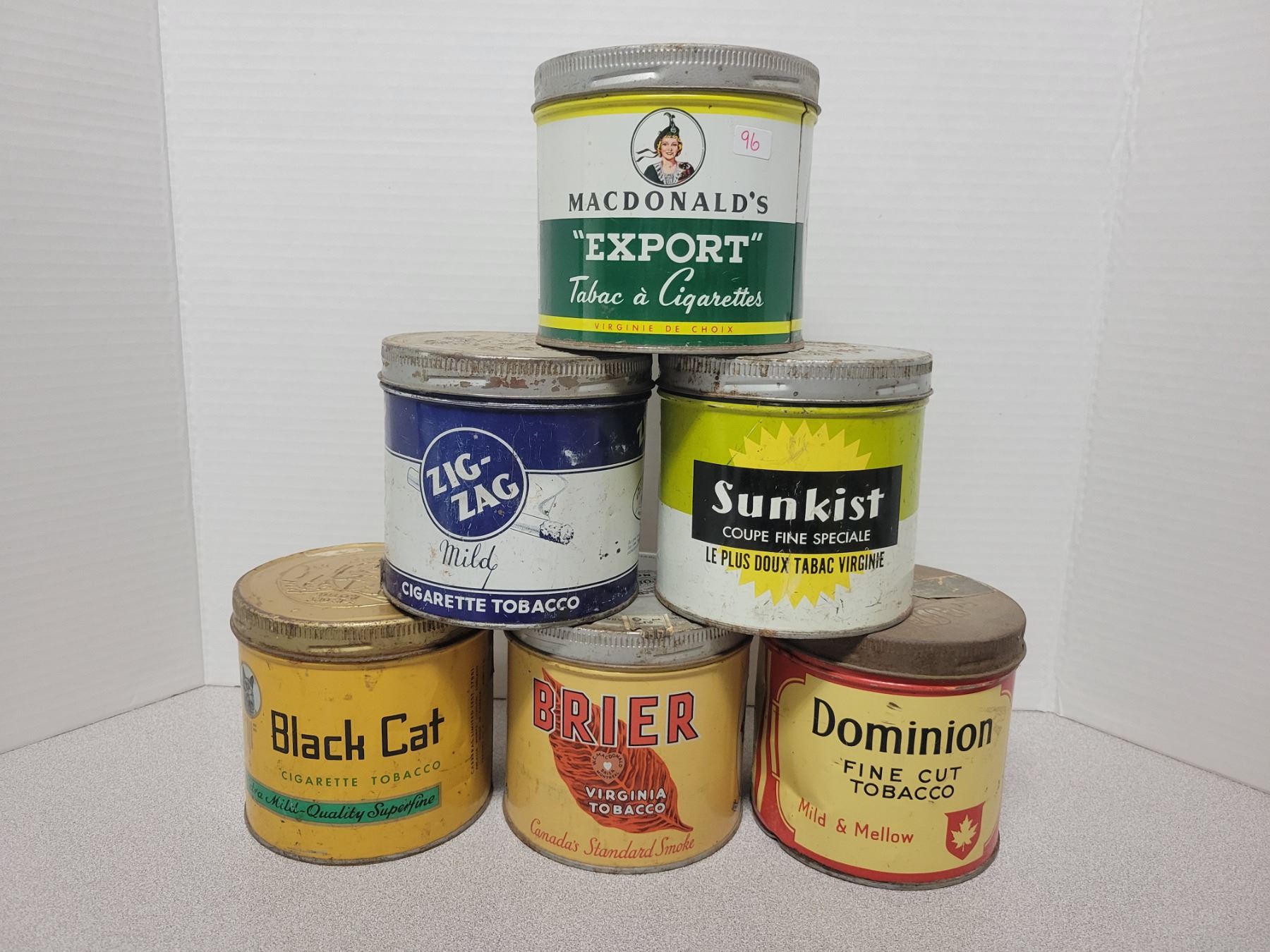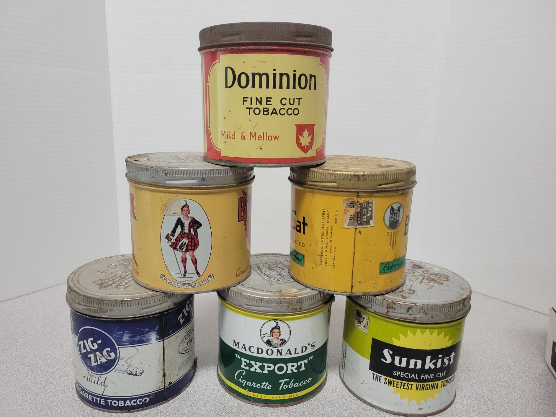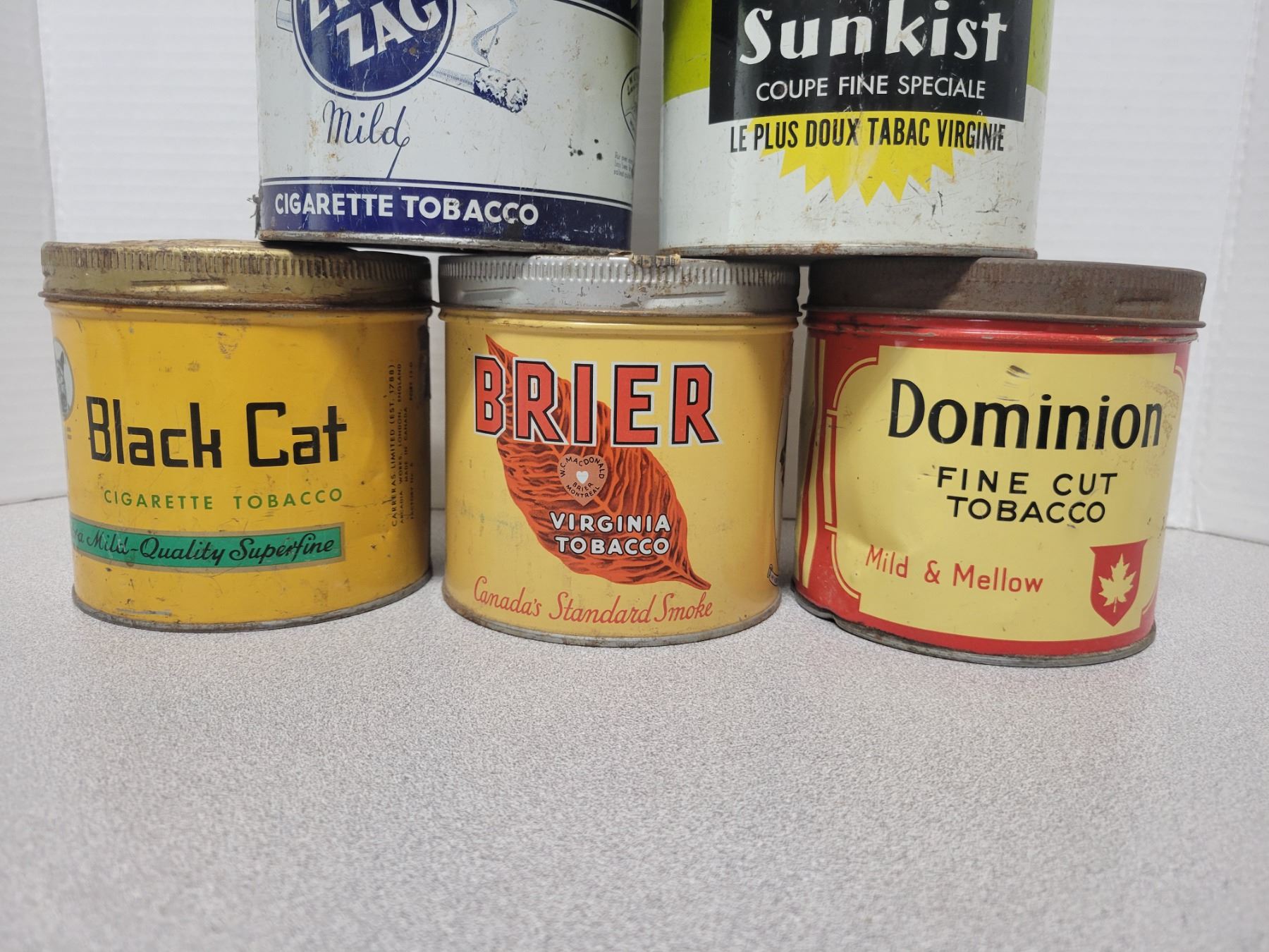 6 Tobacco tin - Brier, Dominion, SunKist, ZigZag, Black Cat, MacDonalds