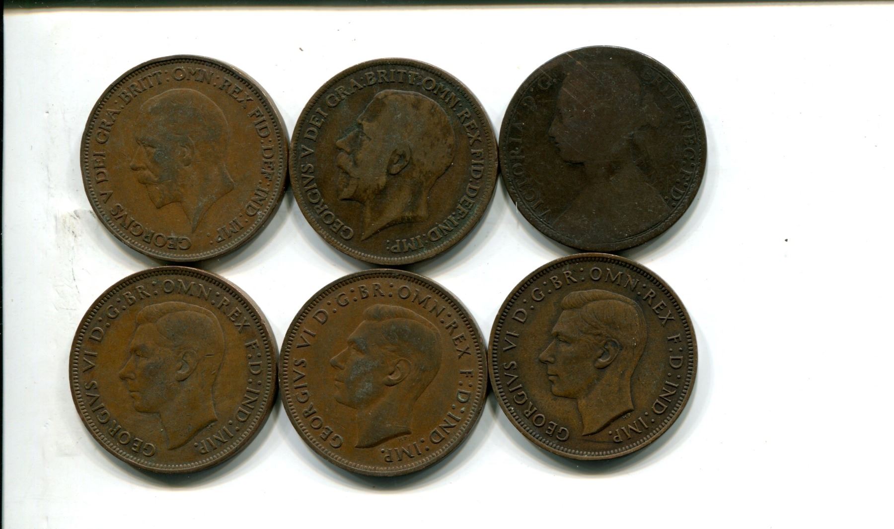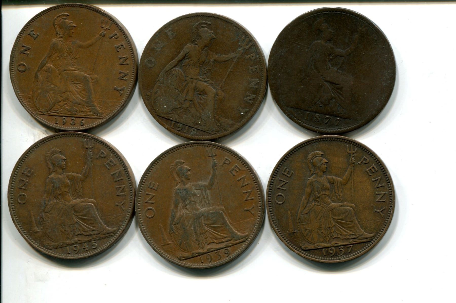 6 UK large one penny 1877, 1919, 36, 37 39, 45
