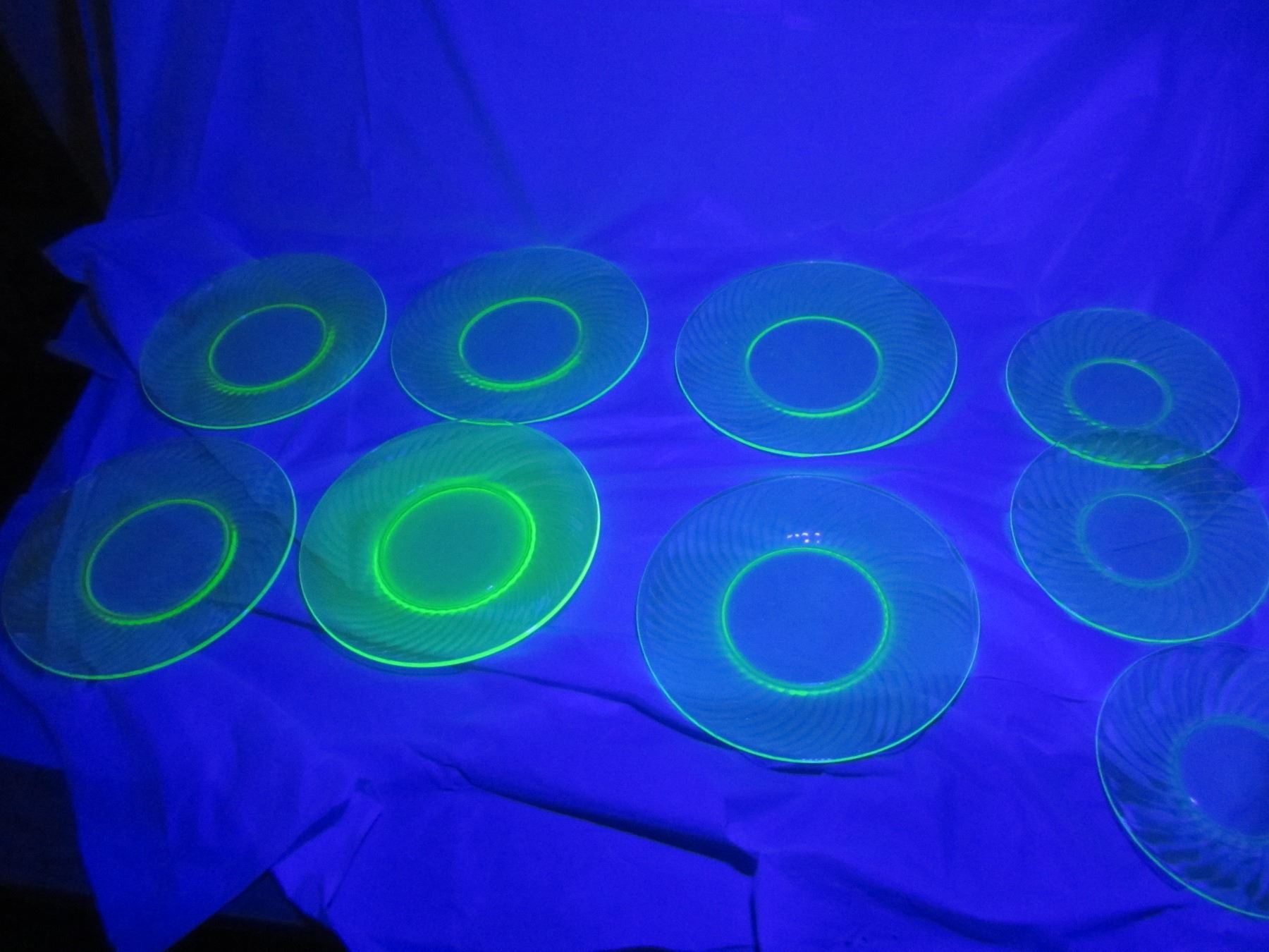 6 Uranium Glass 7 ¾ inch and 3 Uranium Glass 5 ½ inch Plates no Damage