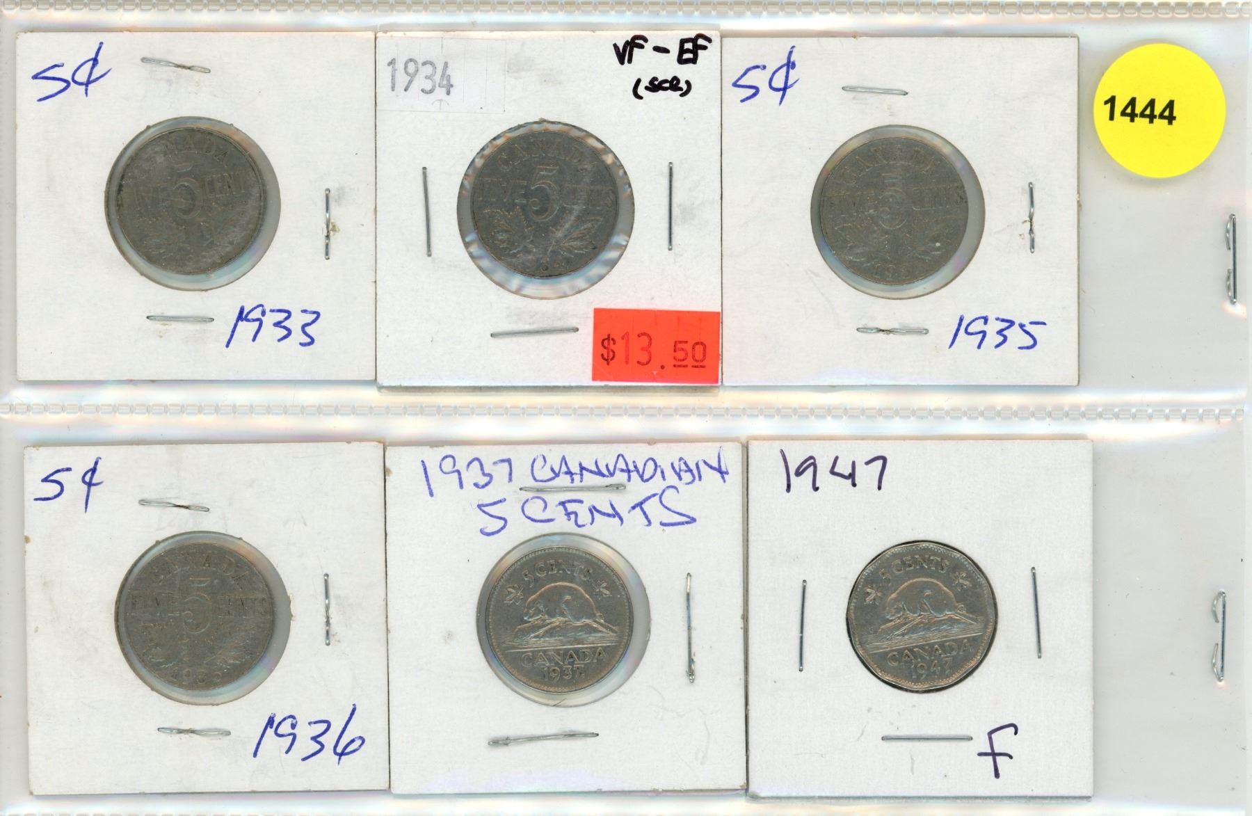 6 X Canadian 5¢ - 1933, 1934, 1935, 1936, 1937, 1947